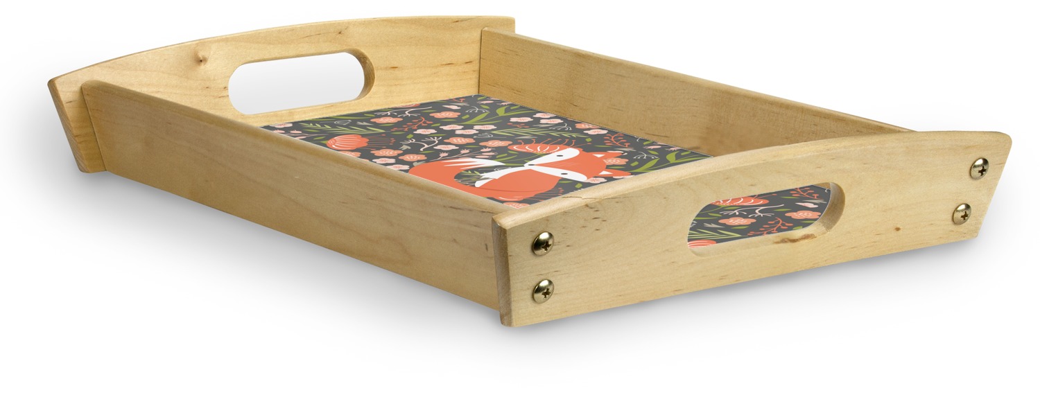 This serving tray with handles features square edges and two rounded sides, creating a very modern look. Each side is fabricated from a beautifully cut, natural wood. The bottom of the interior of the tray displays your customized design in bright, vibrant color. The tray is sold in both a black color and a natural wood look. Each variation of the wood serving tray has two sizes: Small, which is 14" x 10" x 2.25", and Large, which is 19.5" x 13.5" x 2.75".