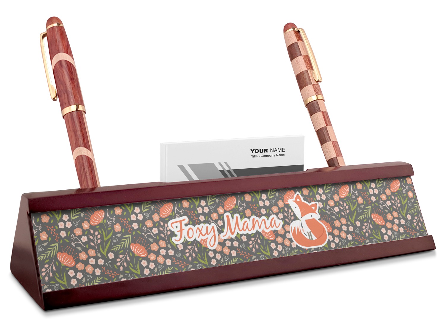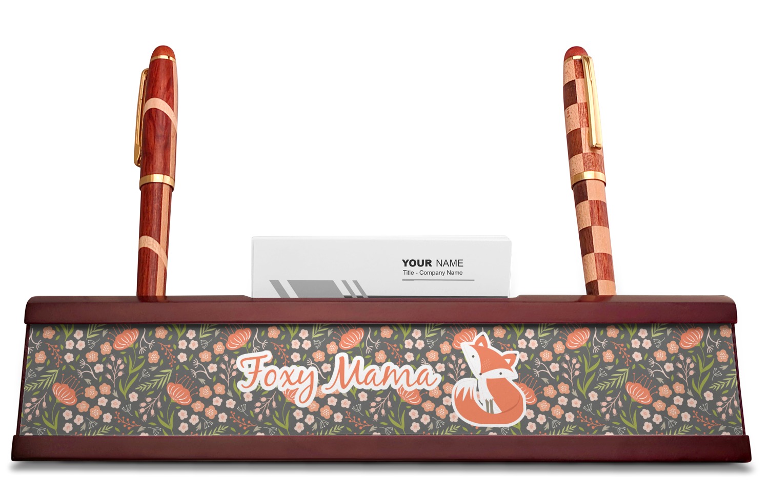 Your desk name plates are crafted from a high-quality, dark-cherry mahogany. At approximately 9.5 by 1.875 by 2.5 inches, this name plaque will fit perfectly, front and center, on your desk. Your customization spans across the entire face of the nameplate. Behind the nameplate lies a skinny slot that can fit approximately 15, traditionally-sized, business cards. You can also store your writing utensils on either side of this custom desk name plate.