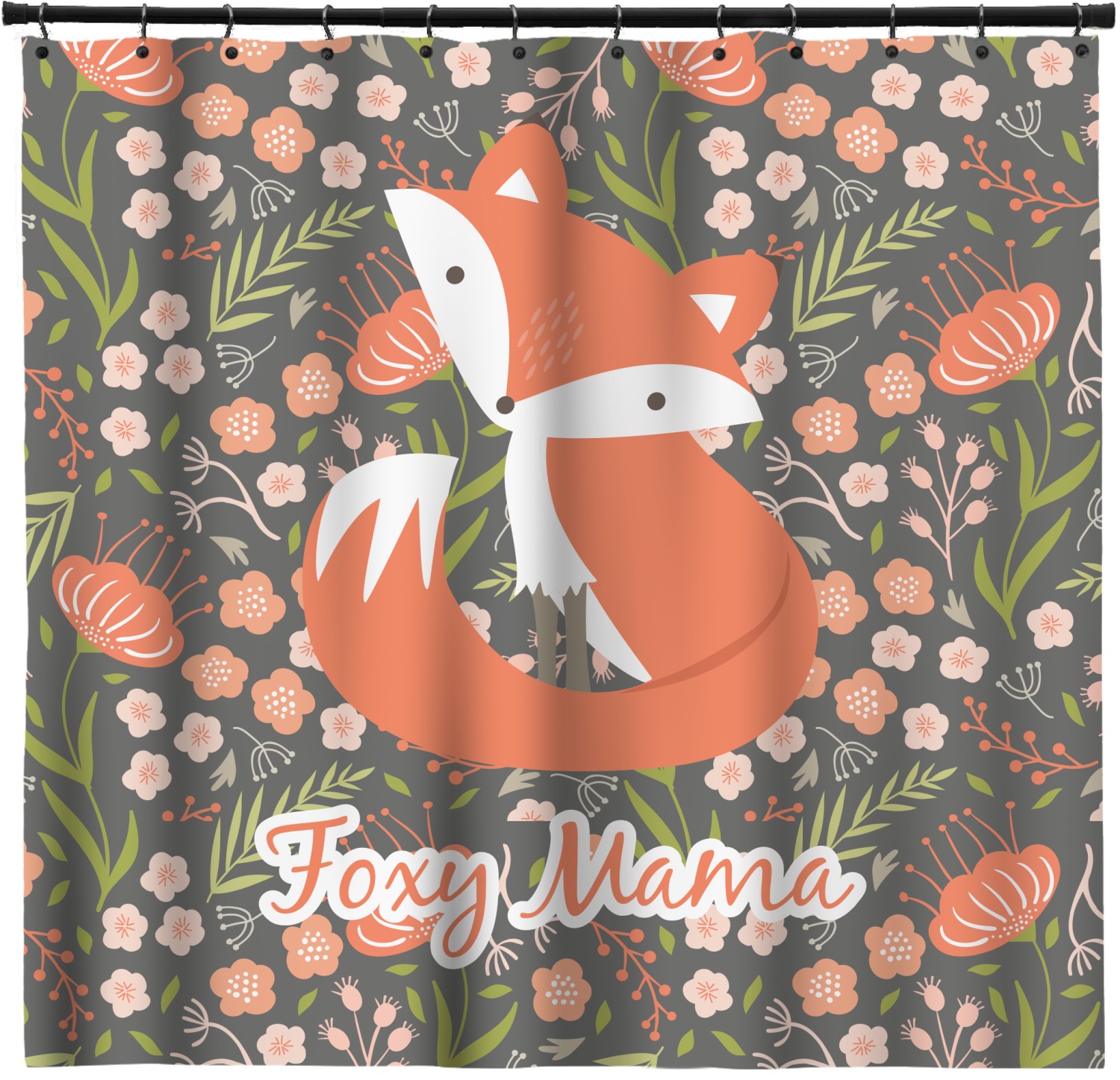For this design we chose the fox trail floral with those big beautiful flowers in the same orange color as the fox. We chose fox graphic #5 - because we love the way the head is titled and the tail curled up in front. We have several other graphic in our system that you can choose from. We chose to personalize with Foxy Mama.