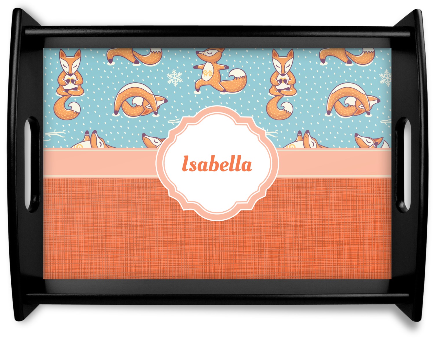 This serving tray with handles features square edges and two rounded sides, creating a very modern look. Each side is fabricated from a beautifully cut, natural wood. The bottom of the interior of the tray displays your customized design in bright, vibrant color. The tray is sold in both a black color and a natural wood look. Each variation of the wood serving tray has two sizes: Small, which is 14" x 10" x 2.25", and Large, which is 19.5" x 13.5" x 2.75".