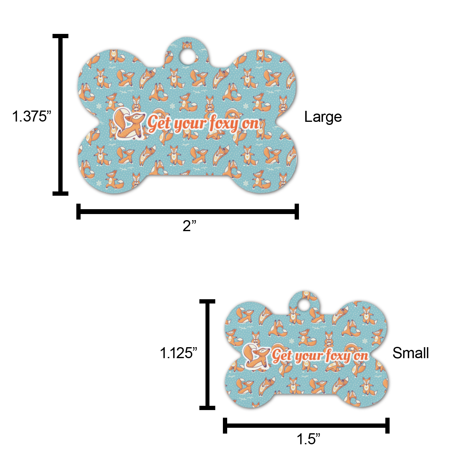 The small bone dog tag size is perfect to pair with our small dog collars, the large size pairs well with our large dog collars.