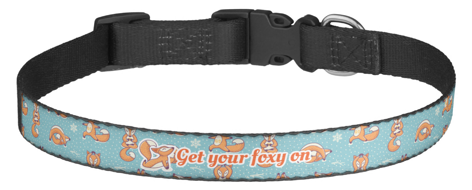 This sturdy collar, made from a durable nylon weave, will outlive your dog's episodes of excited tugging and pulling. Courtesy of its thick plastic buckle and adjuster, this collar is adjustable and accommodating of any dog. Structurally, the collar is a single piece of nylon weave that is sewn together, and features a solid metal loop where you can attach a leash or dog tag. We print and display your dog's name and pattern across the middle of the personalized dog collar.
