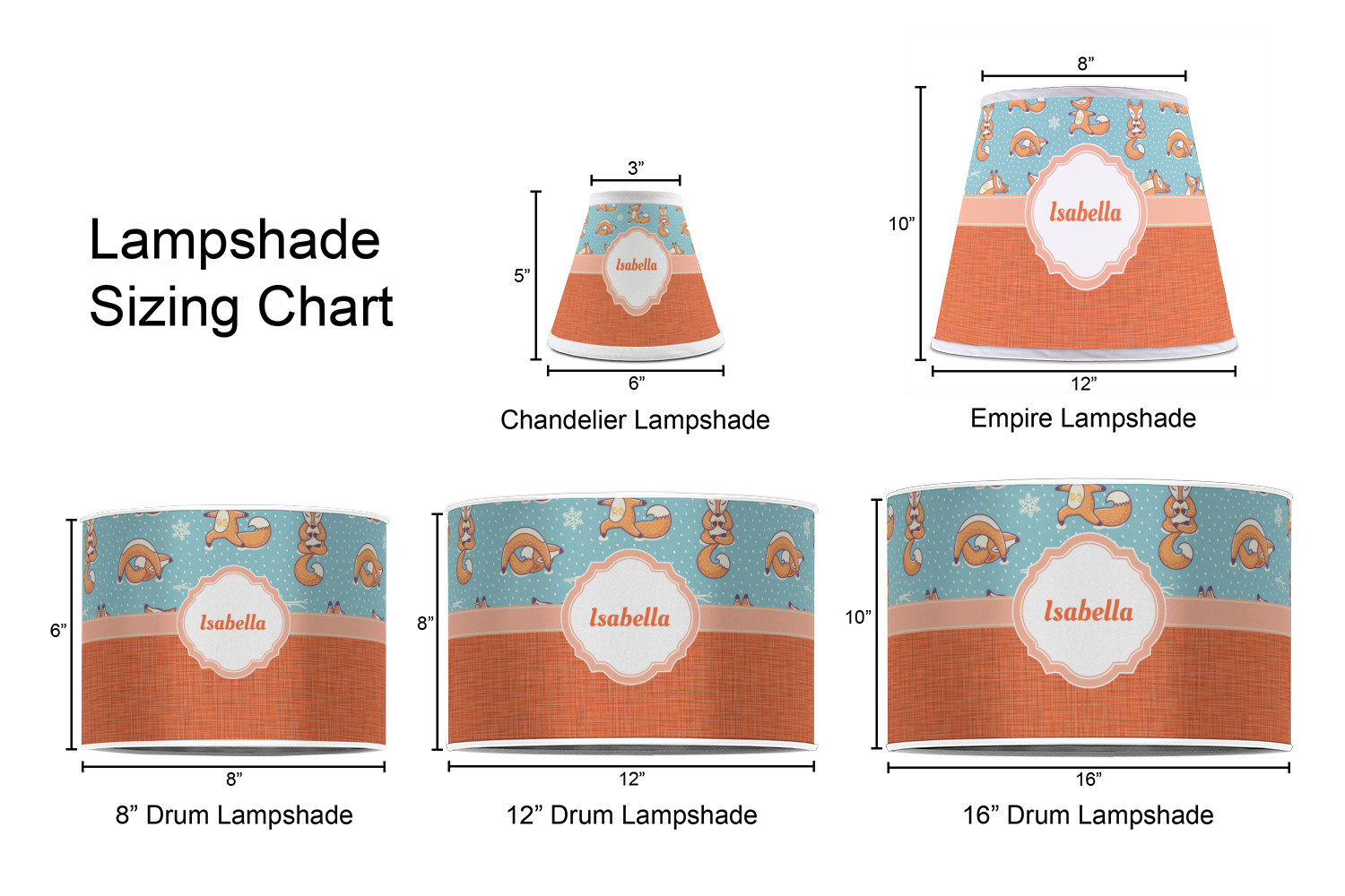 Our customized lamp shades also come in 3 different sizes: 8", 12" and 16", measuring at 8" in diameter by 6" tall, 12" in diameter by 8" tall, and 16" in diameter by 10" tall, respectively.