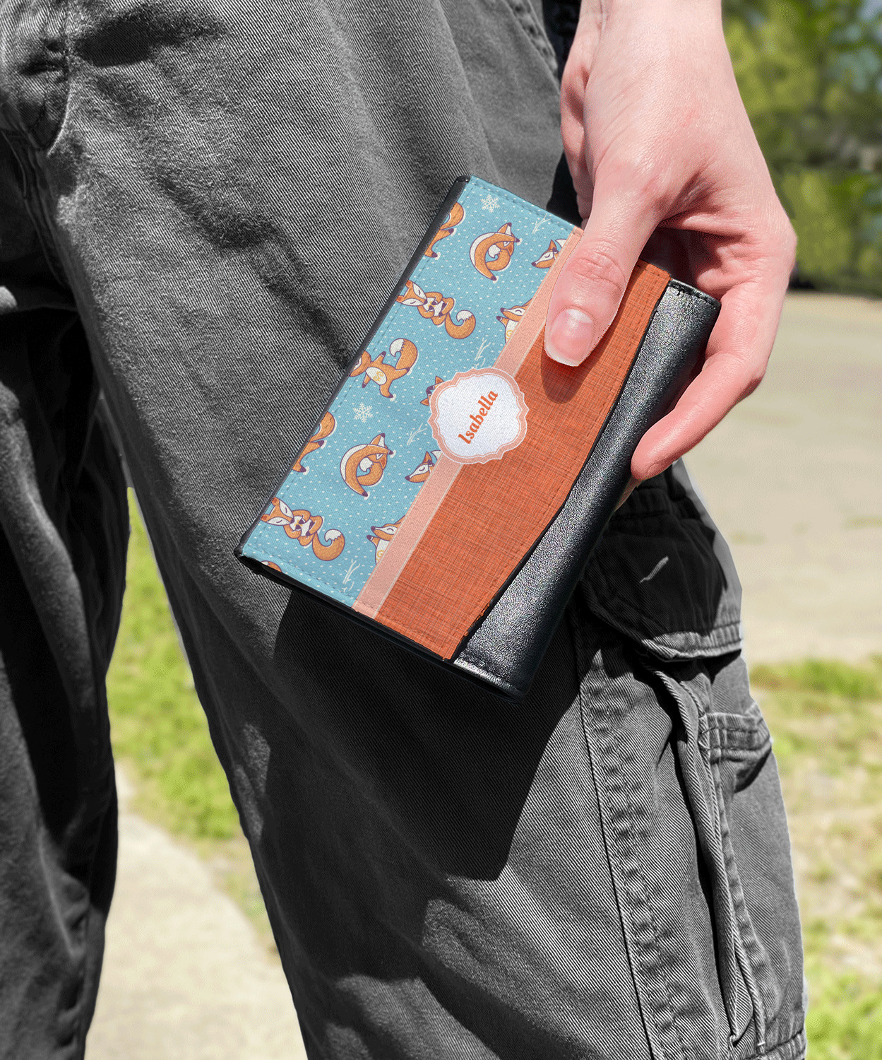 The compact size of this wallet - 5.5in wide, 3.5in tall and 0.75in thick when folded - makes it perfect to hold in hand and small enough to fit in a clutch or a normal size purse. The outside flap is customized with your choice of artwork and closes with a snap closure - with two different snaps to allow it to be adjusted when storing more items - to securely fasten the flap.