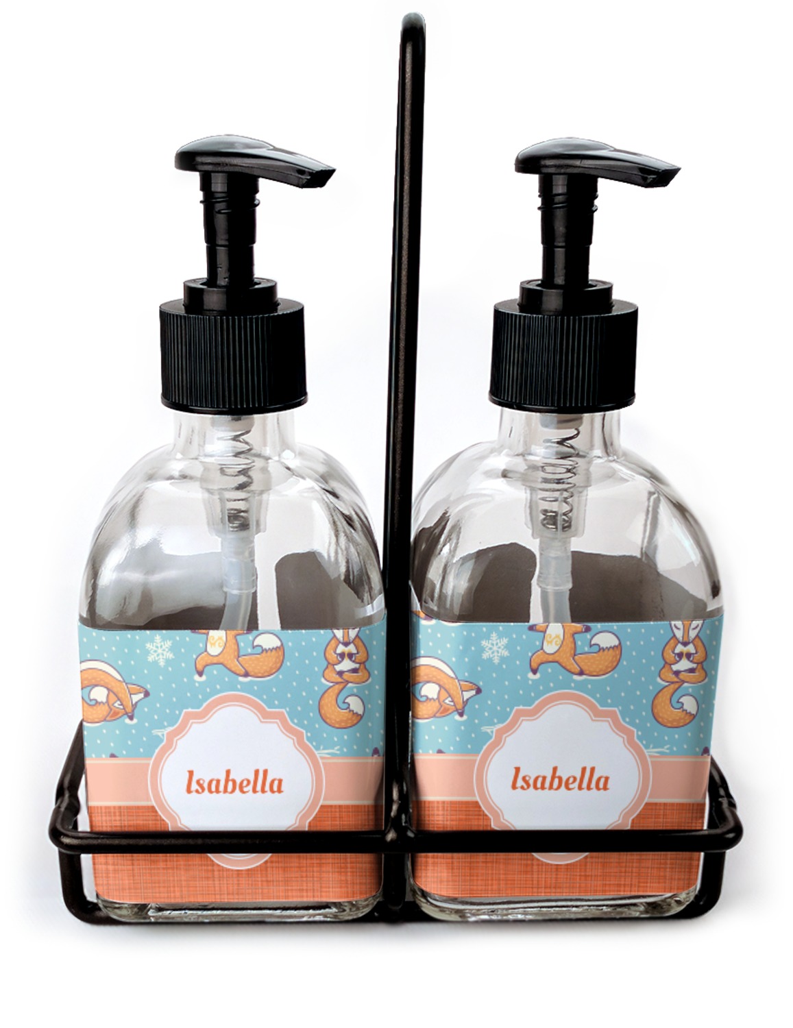 You can purchase these personalized soap dispensers as singulars, or as a set with two bottles. With your purchase of the set, we include a black frame that complements the black color of the pumps and adds to the overall classy look of the piece.