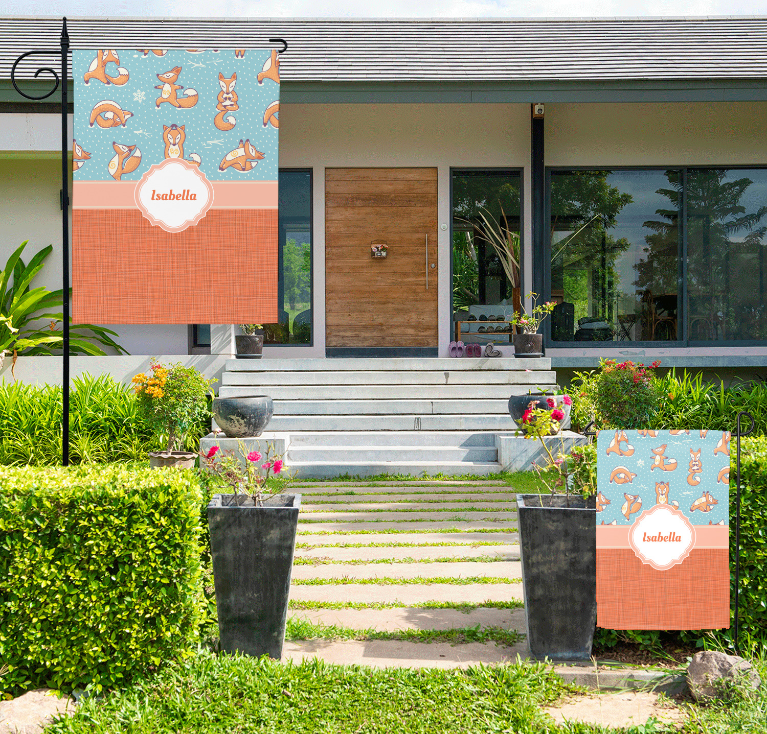 These custom garden flags are made of a durable, double-ply, polyester weave, allowing them to withstand the elements year round. The small flags measure at approximately 12 by 18 inches. The large flags measure out to 28 by 37 inches. You can order these decorative flags with your customization printed on the front only, or the front and back.