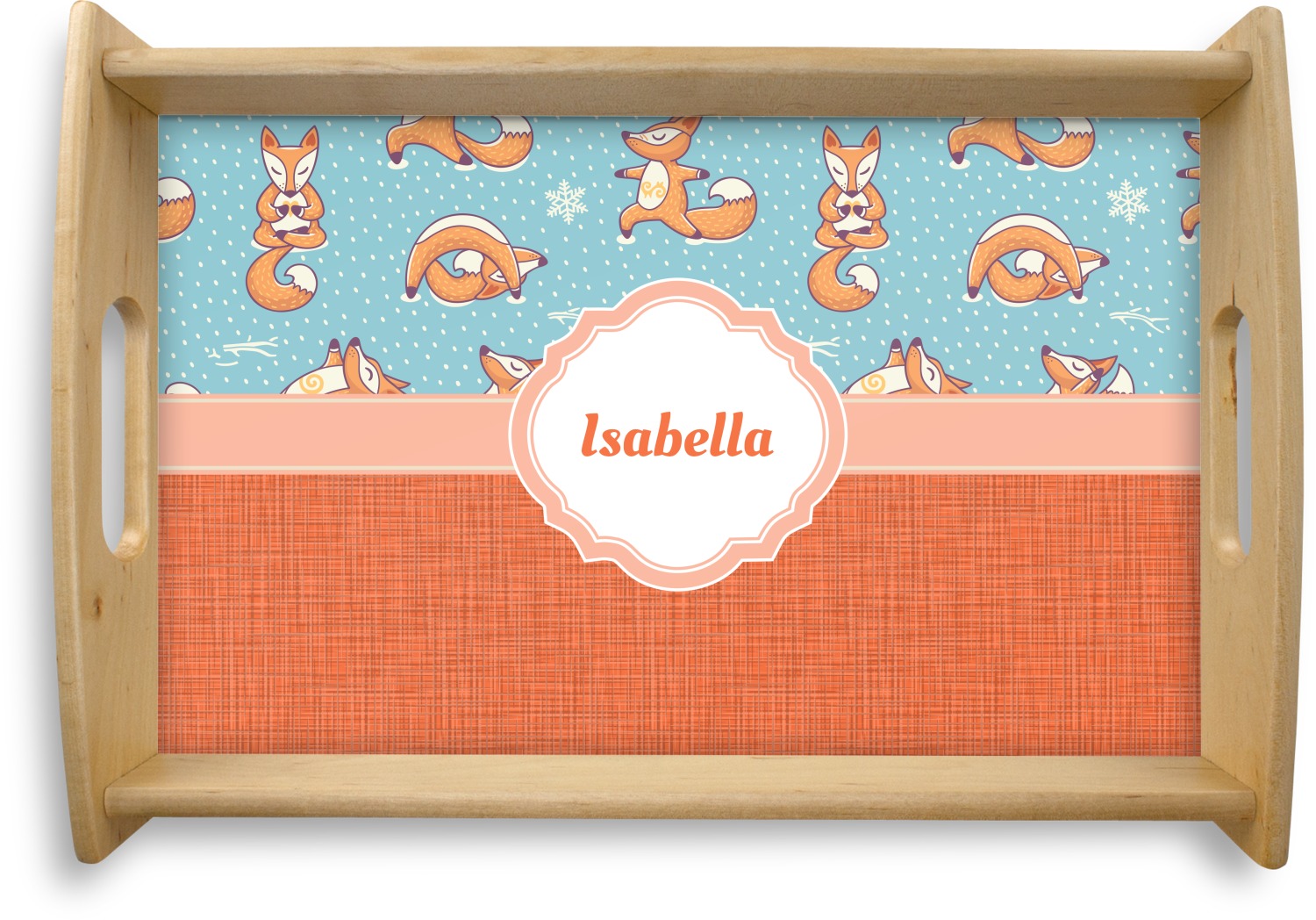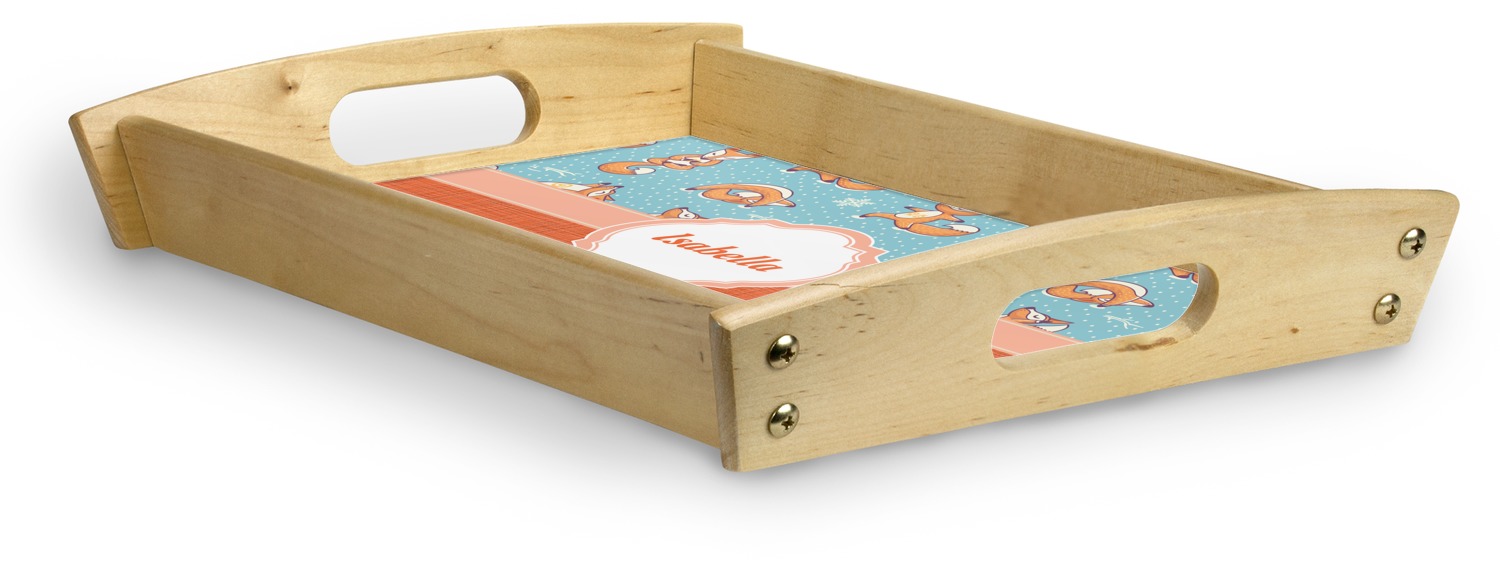 This serving tray with handles features square edges and two rounded sides, creating a very modern look. Each side is fabricated from a beautifully cut, natural wood. The bottom of the interior of the tray displays your customized design in bright, vibrant color. The tray is sold in both a black color and a natural wood look. Each variation of the wood serving tray has two sizes: Small, which is 14" x 10" x 2.25", and Large, which is 19.5" x 13.5" x 2.75".