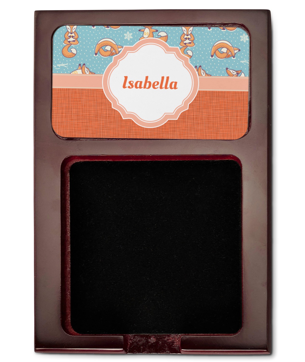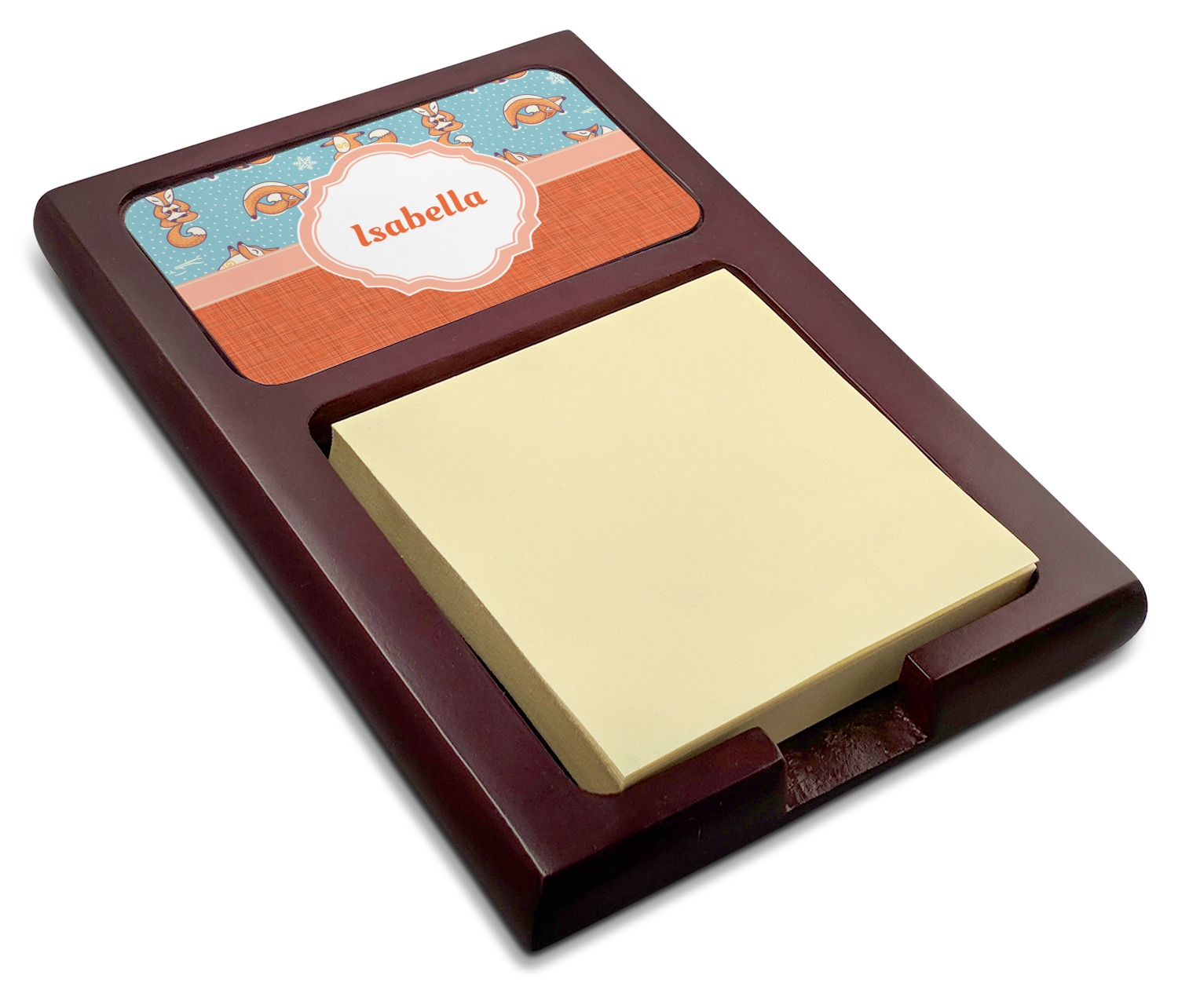 Crafted from a fine mahogany, this post it note holder is in the shade of a dark, cherry color. The dispenser itself is about 4.25 by 6.25 by 0.75 inches. You can place your 3 by 3 inch sticky notes in the indentation below the nameplate. We print your customization onto the nameplate that rests above the velvety indentation.
