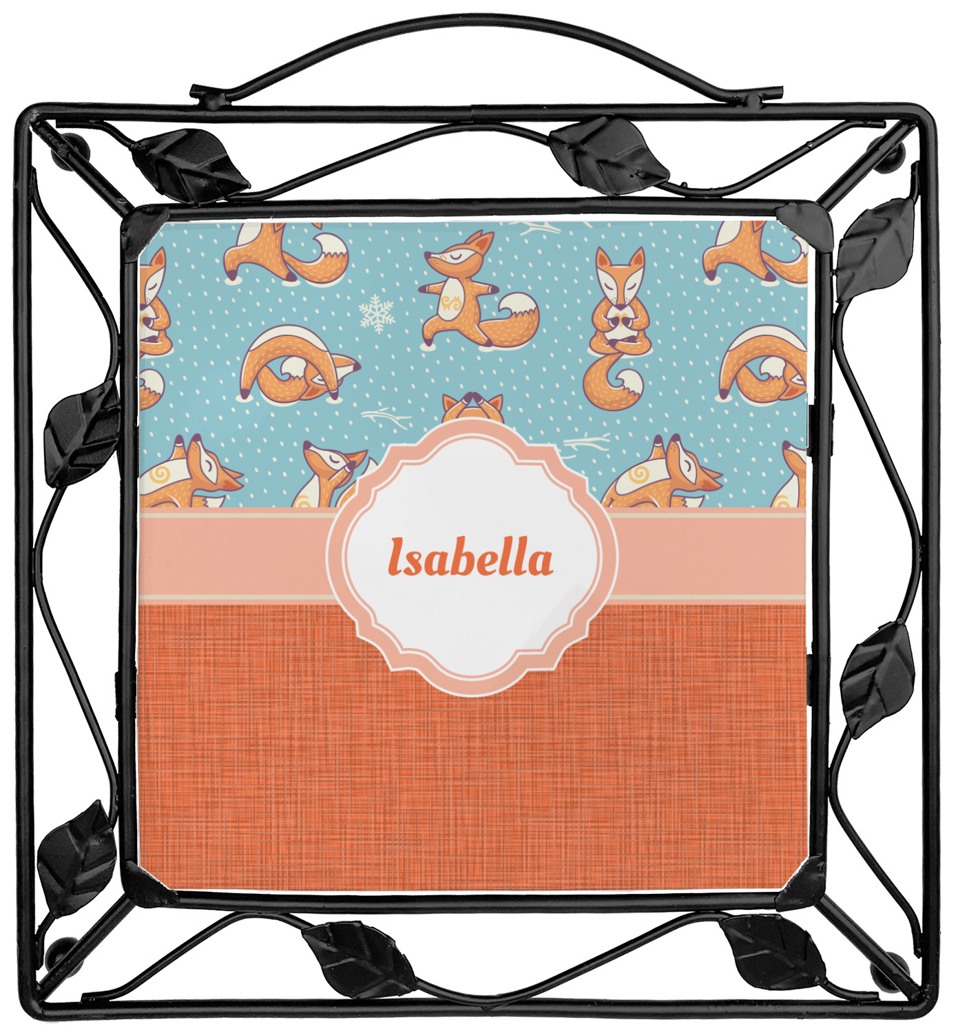 Our square trivets are made from a durable, wrought iron. This model features 4 small half circles, one on each corner, and a larger ring of iron that circles the central, customized tile. Each of the 4 corners has a round foot on its bottom for stability. This trivet is 8.75 by 8.75 inches, but the central tile measures at 6 inches on both sides.