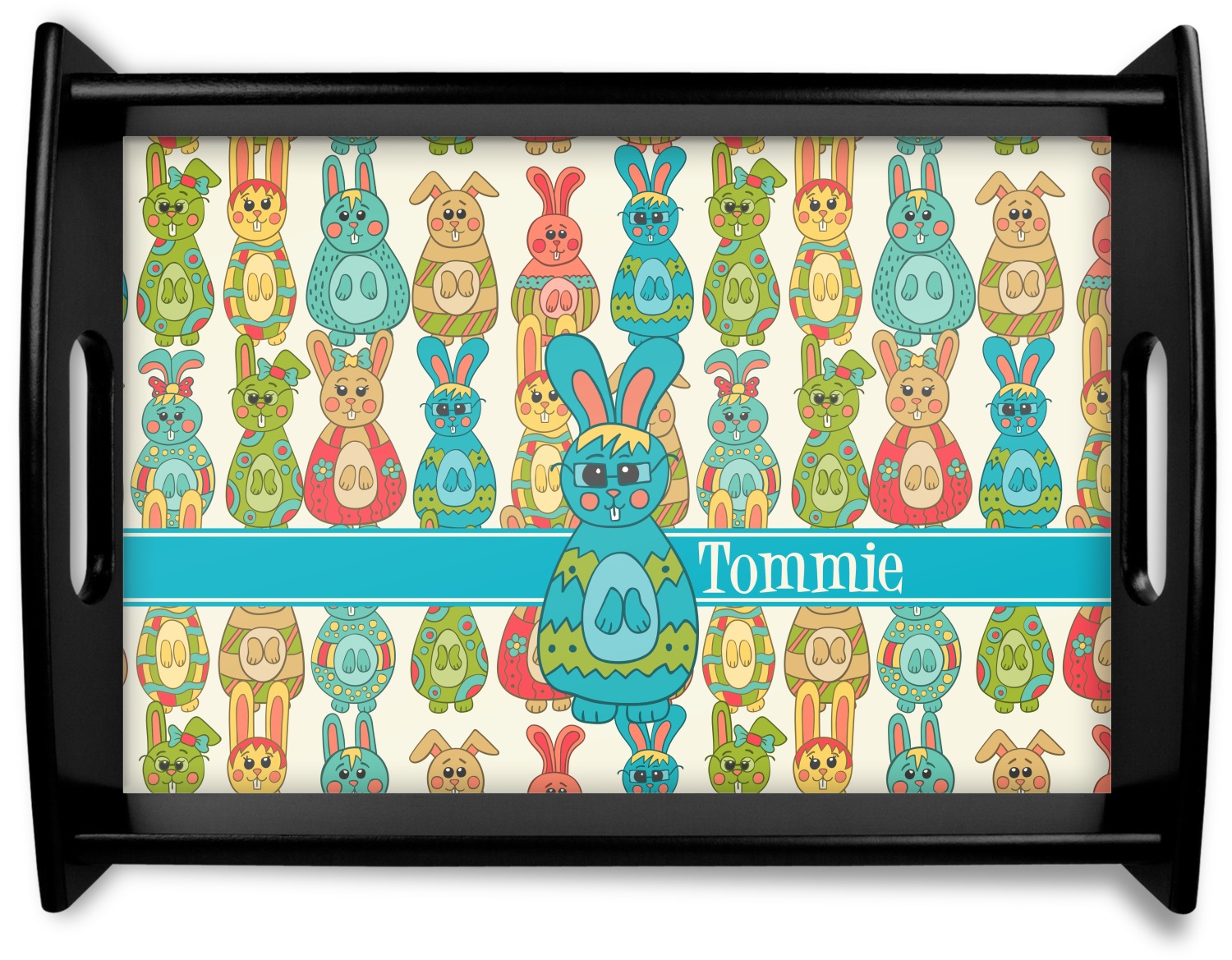 This serving tray with handles features square edges and two rounded sides, creating a very modern look. Each side is fabricated from a beautifully cut, natural wood. The bottom of the interior of the tray displays your customized design in bright, vibrant color. The tray is sold in both a black color and a natural wood look. Each variation of the wood serving tray has two sizes: Small, which is 14" x 10" x 2.25", and Large, which is 19.5" x 13.5" x 2.75".