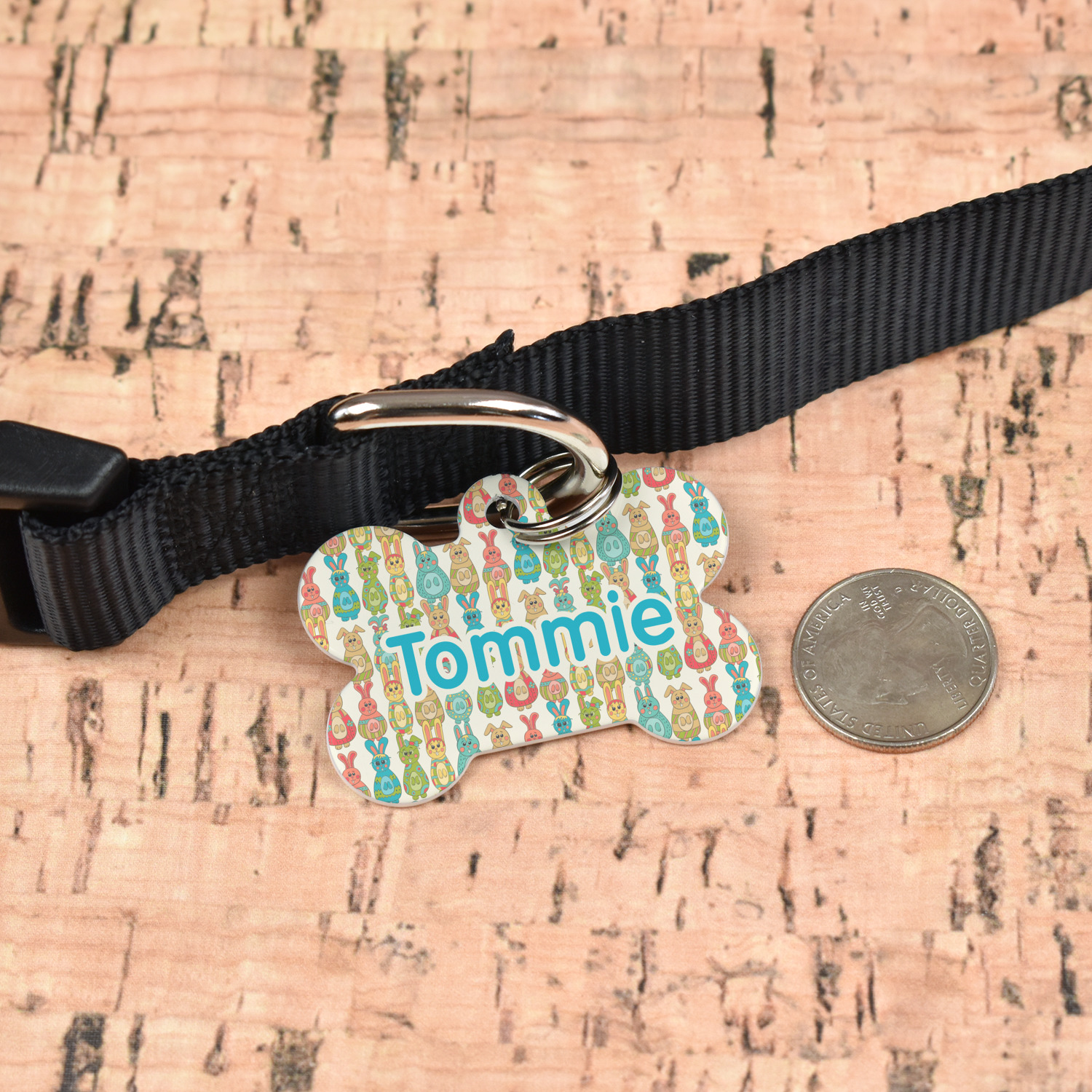 The small bone dog tag size is perfect to pair with our small dog collars, the large size pairs well with our large dog collars.