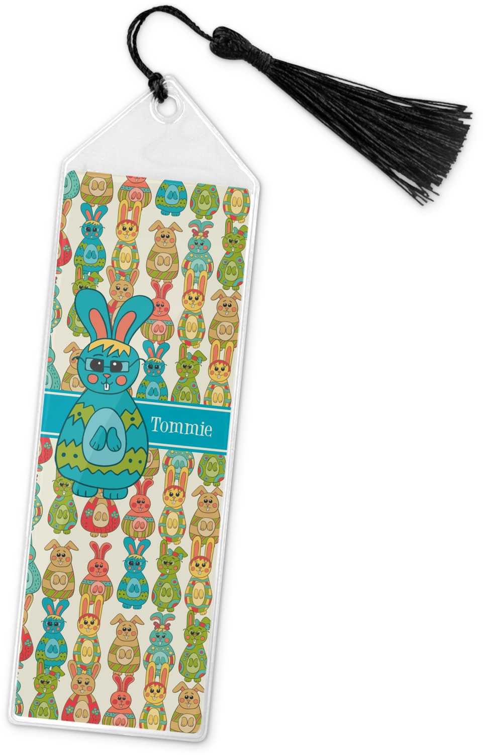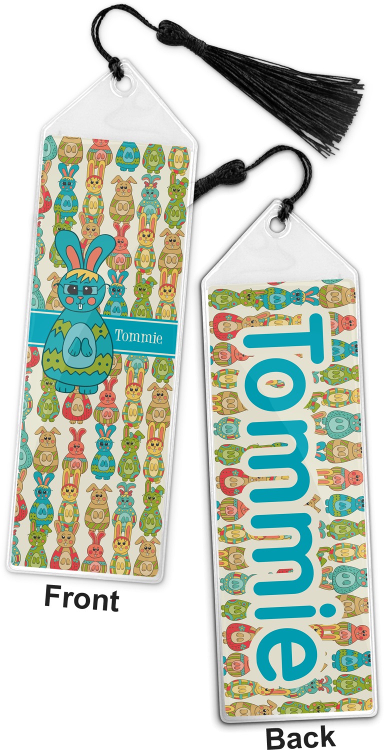 Your personalized bookmark is made of a sturdy, clear vinyl, and is approximately 7.5" x 2.25". We display your personalization on vinyl inserts that are placed on both sides. Accompanying each book marker is a black, fringe tassel that attaches to the reinforced, triangular header.