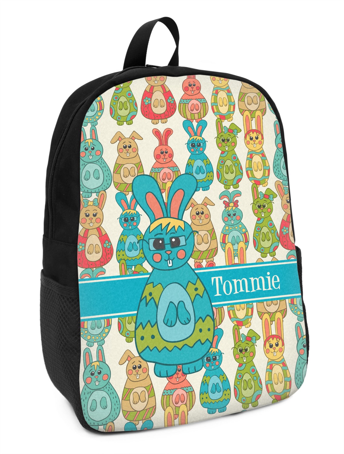 These small backpacks are made of a durable black canvas material with your personalization right on the front. The two shoulder straps are padded and easily adjustable. The bag itself measures at about 11" W x 15" H x 5" D. It's the perfect size for elementary aged kids or adults who want a smaller backpack. On the top of the bag you will find a handle to hang or carry your backpack by as well as a large zipper closure to keep all of your belongings safe inside. On each side of your backpack is a mesh pocket for a small item or water bottle. Inside your backpack you will find a spacious area with a small zipper pocket and a padded laptop slot that will fit up to a 13" laptop (13" being very snug). This is the perfect bag for any student that needs a couple books and their laptop with them at all times. It also works great as a carry on for traveling!