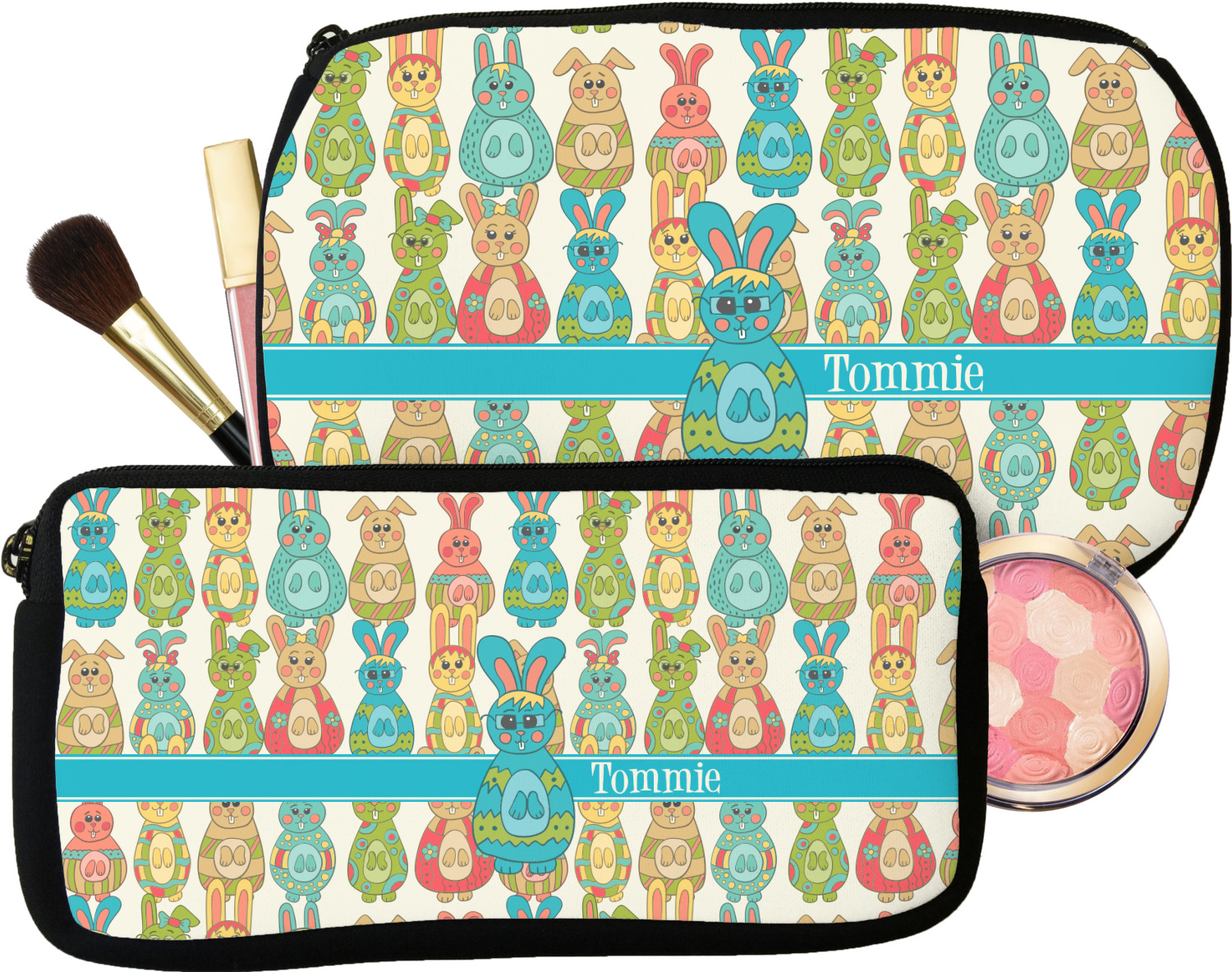 Our personalized makeup bags are available in many different designs, patterns and colors - so you are sure to find one that will love. They are made of neoprene (same material as wet-suits) and thus are water resistant, so spillages in your makeup bag will not end up all over you purse. They are customized on one side and are black on the other side and the zipper is black as well.