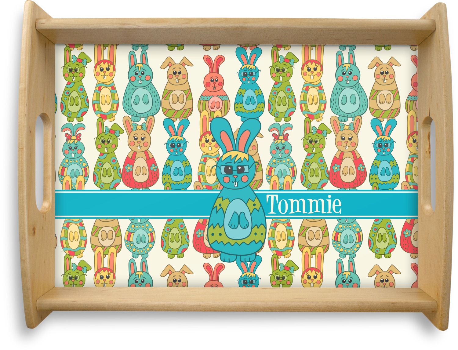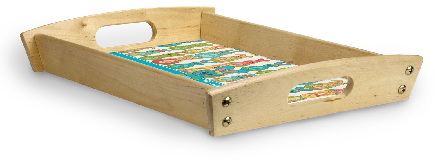 This serving tray with handles features square edges and two rounded sides, creating a very modern look. Each side is fabricated from a beautifully cut, natural wood. The bottom of the interior of the tray displays your customized design in bright, vibrant color. The tray is sold in both a black color and a natural wood look. Each variation of the wood serving tray has two sizes: Small, which is 14" x 10" x 2.25", and Large, which is 19.5" x 13.5" x 2.75".