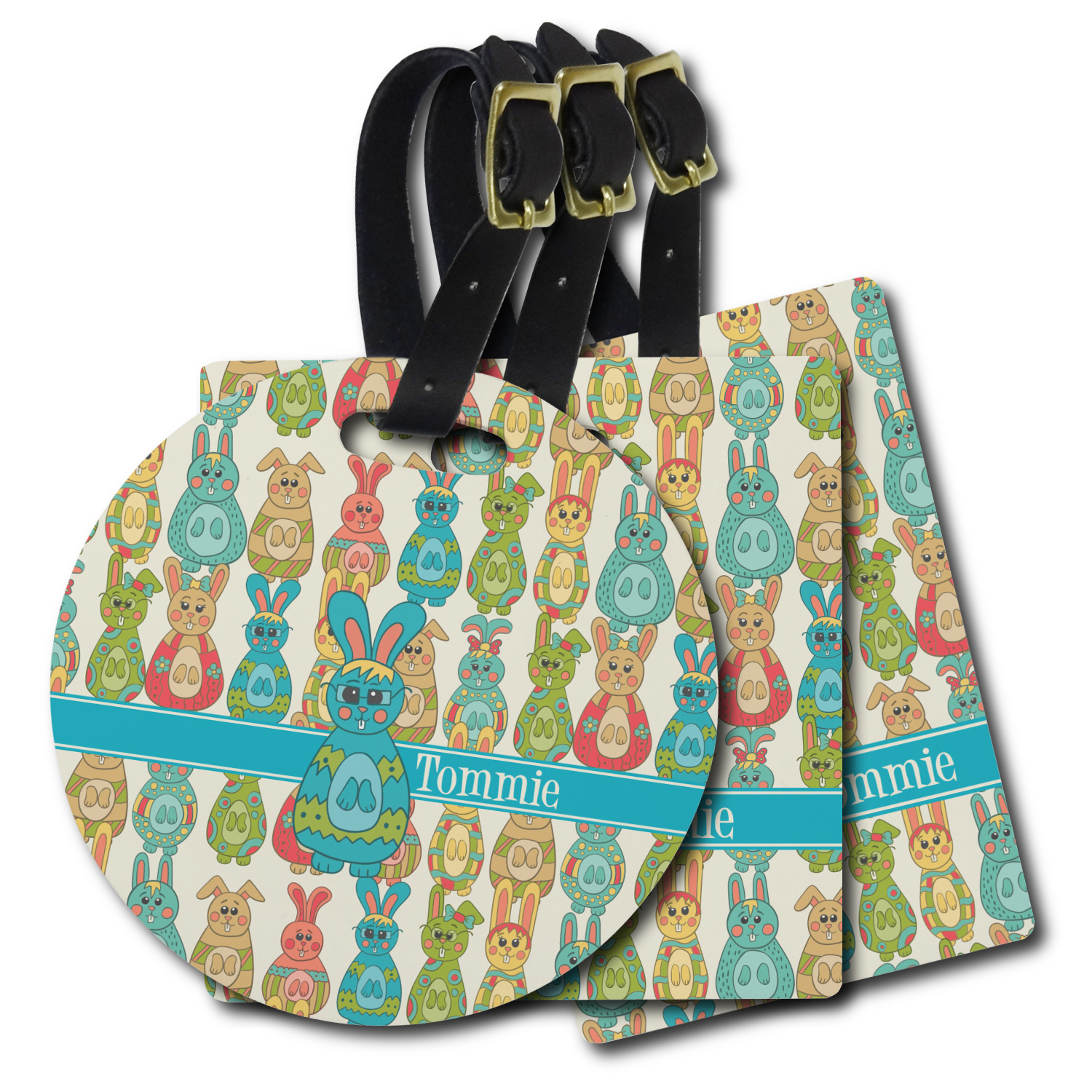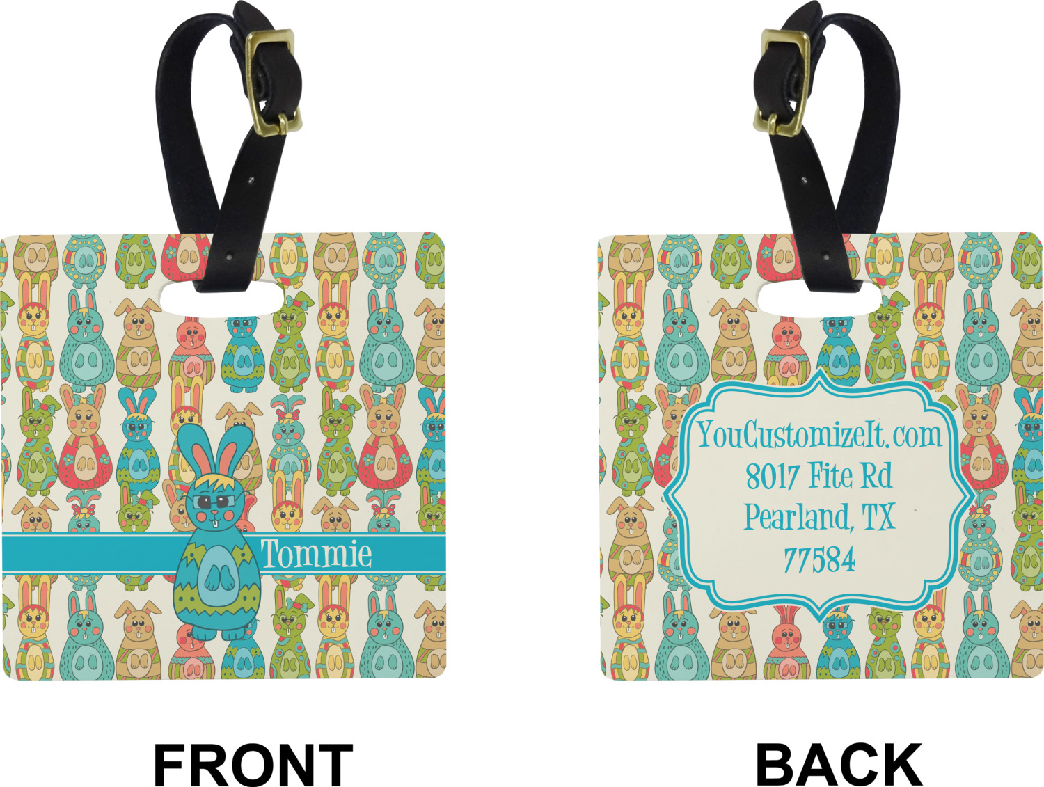 These personalized bag tags are sold in a variety of shapes, so that you may find the product that meets your vision exactly. We sell a round luggage tag, which measures at approximately 4" x 4". Our square luggage tag is about 3.5" x 3.5", while our rectangular version is 2.75" x 4 ".