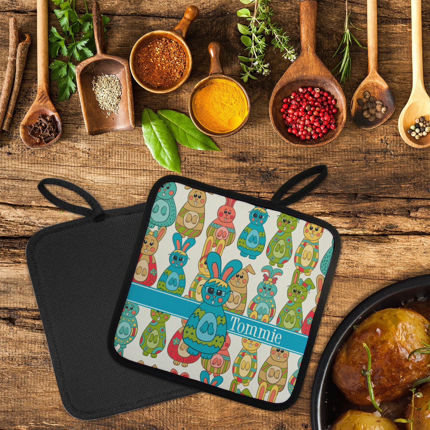 Our personalized pot holders feature a neoprene front that displays your personalization in vibrant colors. The backing of the hot pot holder is rubberized; the textured backing allows you to have a great grip when using this custom pot holder. The two materials are joined with a sleek, black trim, and the holder also includes an attached loop for hanging and storage. The pot holder is approximately 8.75 inches by 8.75 inches and 0.25 inches tall, while the fabric loop is 2.5 inches long. You can purchase a kitchen pot holder by itself or as a set of 2. We also offer a set including one pot holder and one oven mitt.