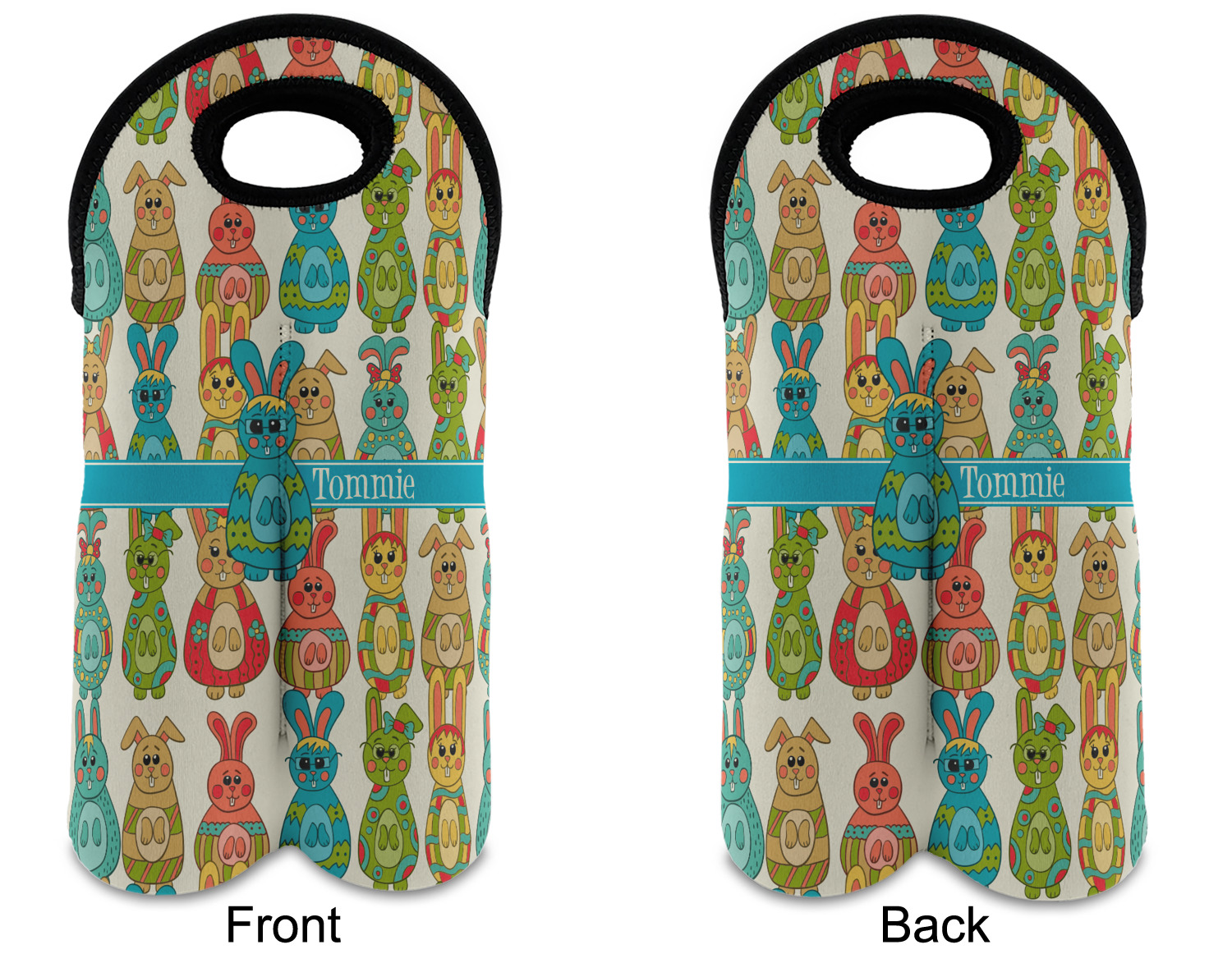 These tote bags are insulated to keep the bottles cold and have a stitched separation down the middle and double handles to keep the two bottles safe and secure during travels.