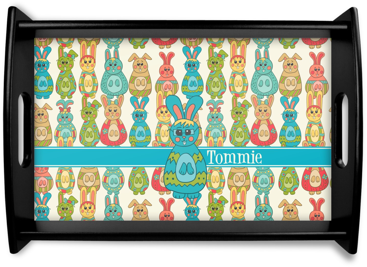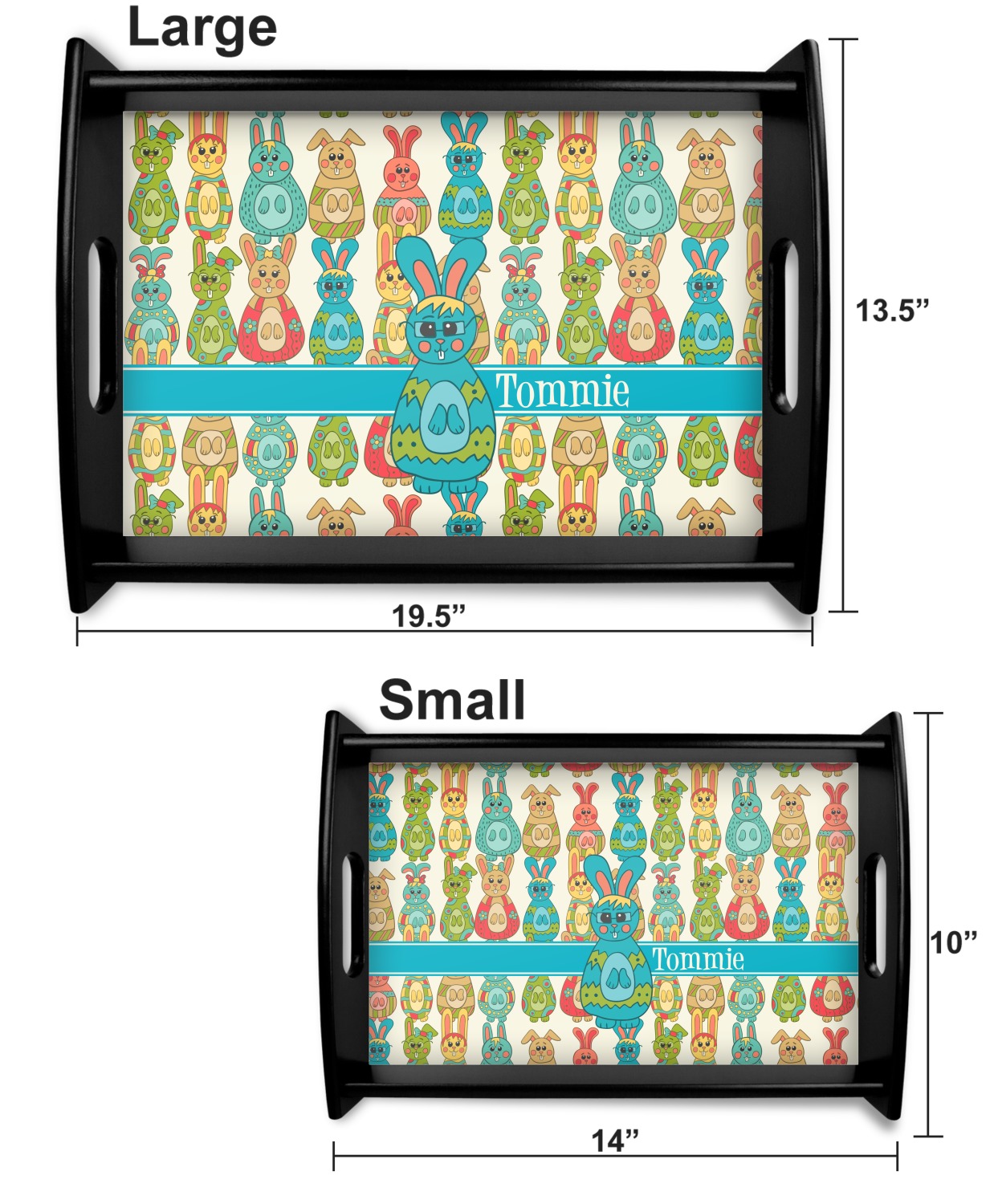 This serving tray with handles features square edges and two rounded sides, creating a very modern look. Each side is fabricated from a beautifully cut, natural wood. The bottom of the interior of the tray displays your customized design in bright, vibrant color. The tray is sold in both a black color and a natural wood look. Each variation of the wood serving tray has two sizes: Small, which is 14" x 10" x 2.25", and Large, which is 19.5" x 13.5" x 2.75".