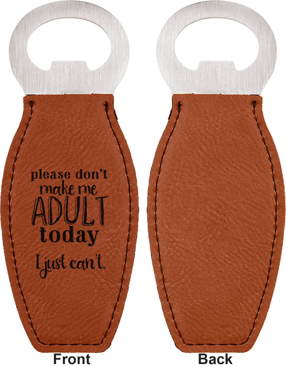 Built from stainless steel, these custom bottle openers are wrapped in a cognac-colored leatherette. Sharp, black stitching lines the edges for extra durability and a finished touch. Your personalization is laser-engraved onto the surface of this leatherette, leaving behind a crisp, black coloration. At 4.6 by 1.8 inches, this beer bottle opener gives you much of leverage when trying to open a stubborn bottle. On the opposite end of the opener, you'll find a magnet that you can use to display your new, unique bottle opener!