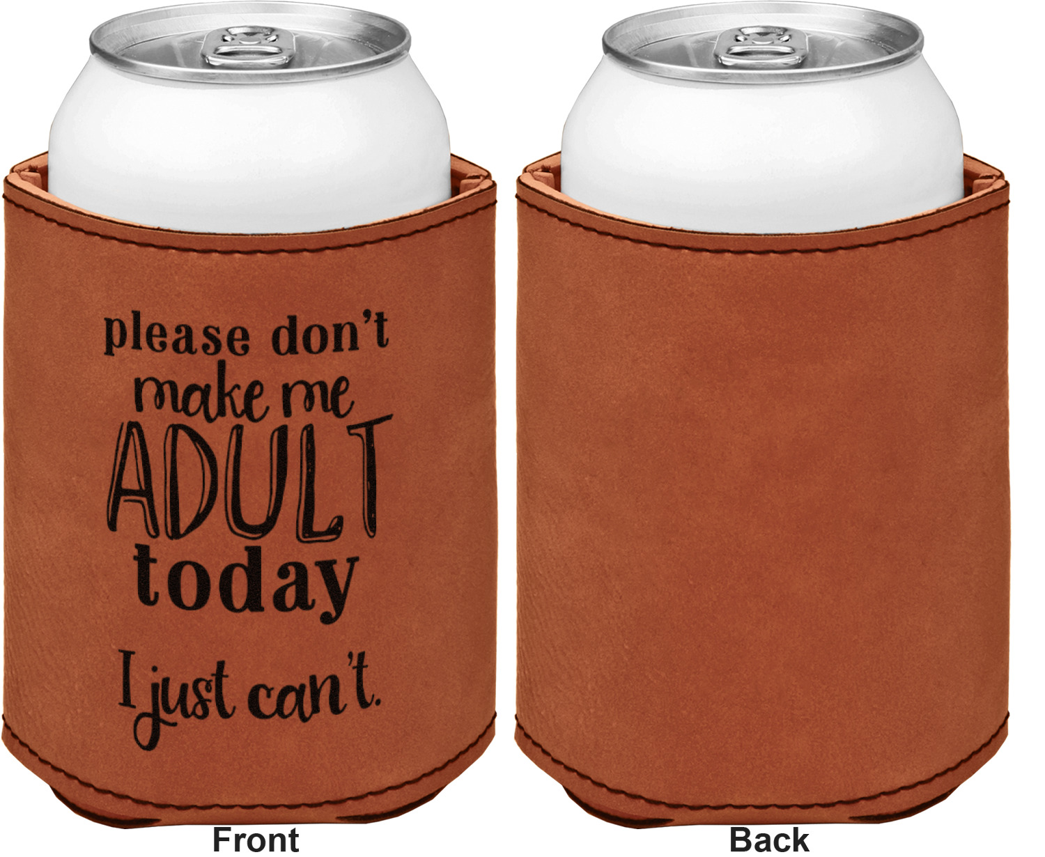 This can sleeve is made from a cognac-brown leatherette and stitched with a sturdy, black thread. A slim padding lines the inside of your can sleeve to allow for a better fit once your drink is inserted. The sleeve itself measures at 4 by 4.5 inches, allowing this custom can sleeve to accommodate most canned drinks. Your personalized design can be engraved on the front and back, or solely the front. When laser-engraved, your design appears as a black coloration which contrasts the leatherette nicely.