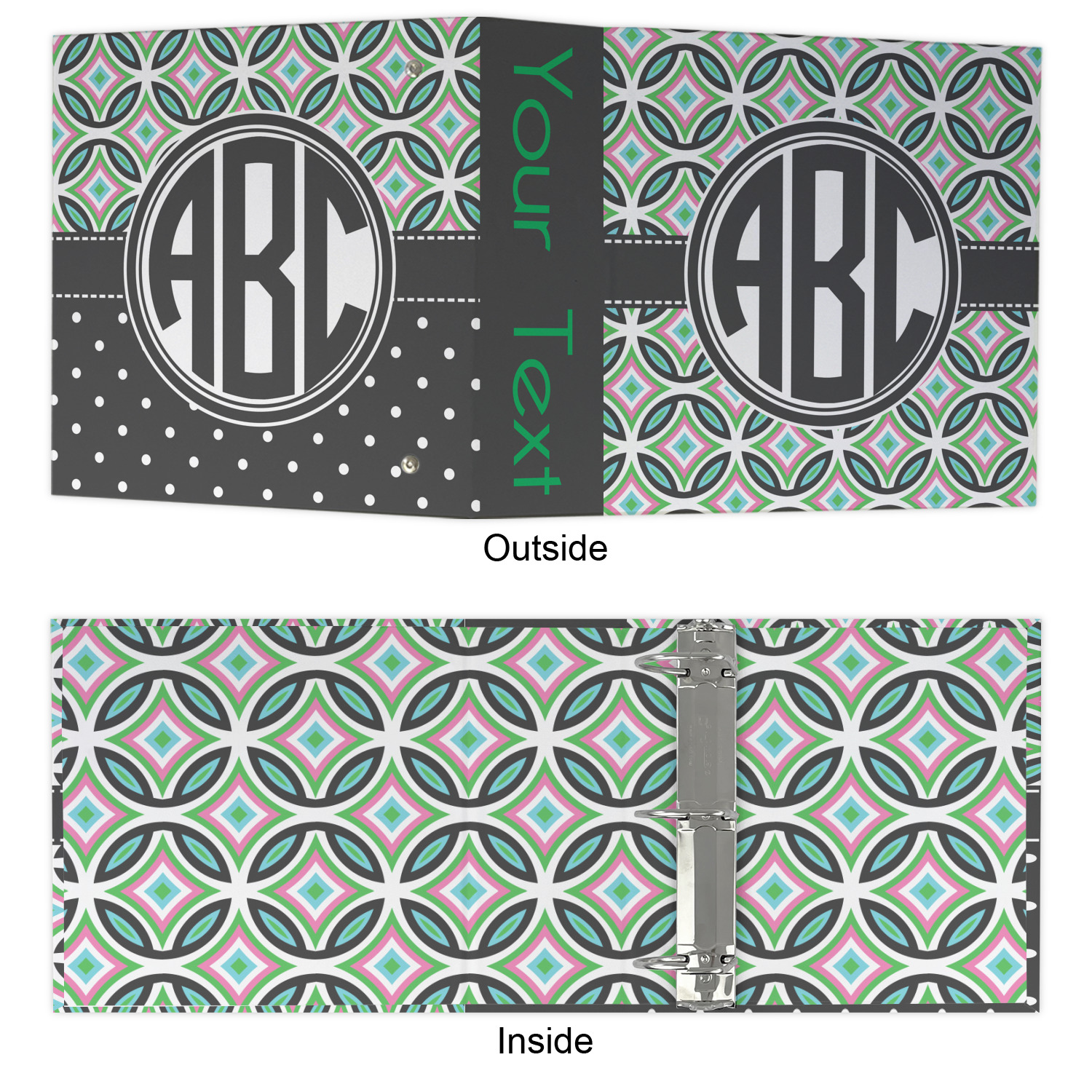 Made from a sturdy cardboard base with a full high quality canvas textured vinyl wrap with the design of your choice. Unlike our standard 3-ring binder with the full wrap design your artwork wraps from the front and back and into the inside of the binder.