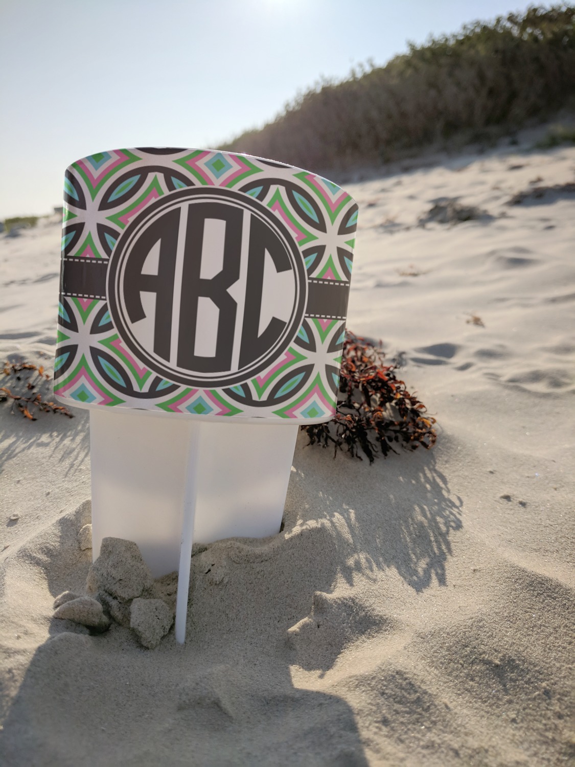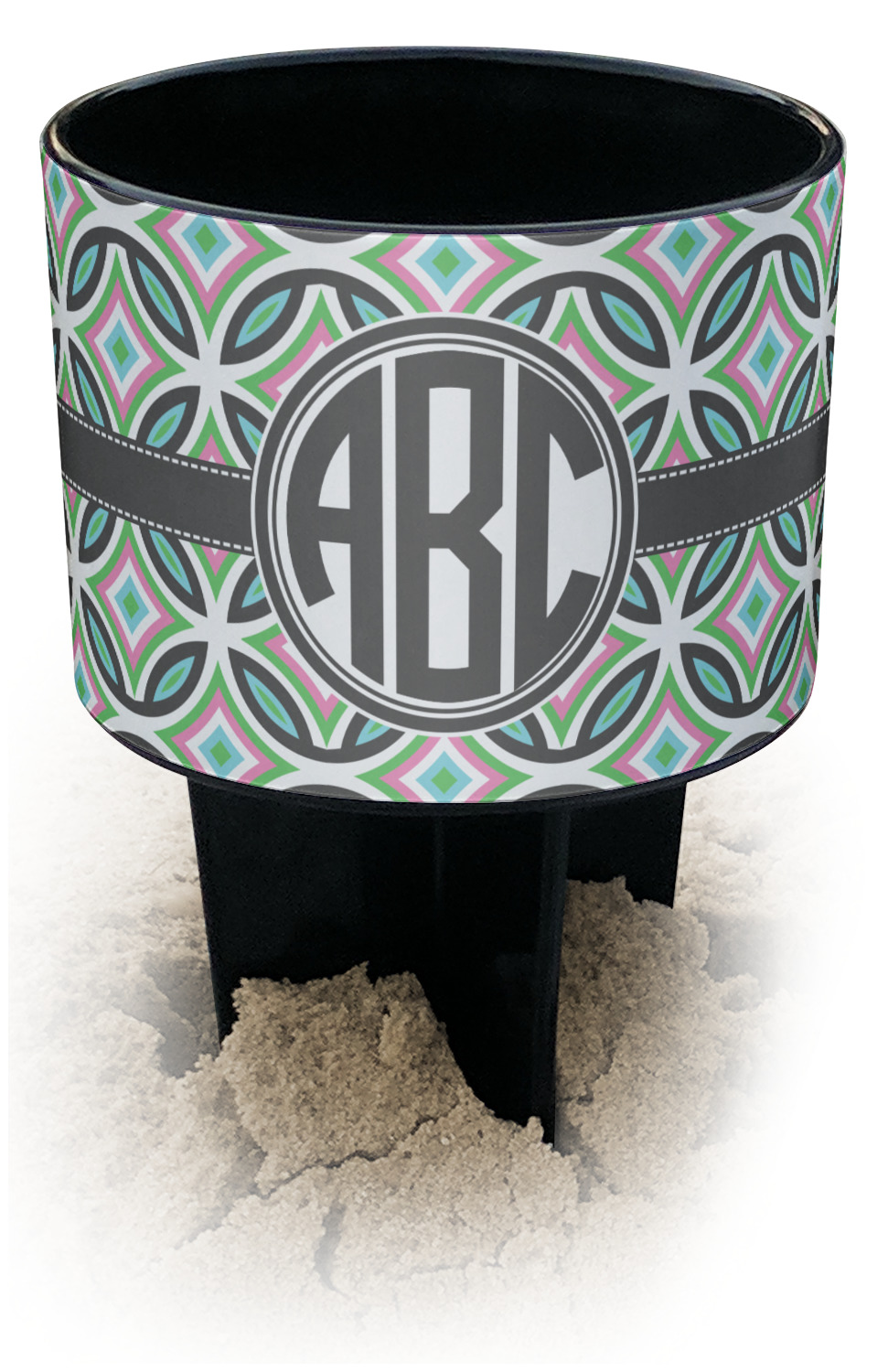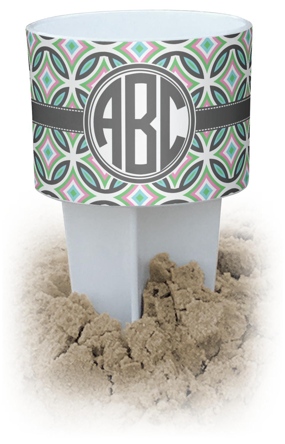 This cup holder has a large stake at its bottom that anchors it to the sand or ground below, while the cup holder rests above the stake. The entire drink holder is made of durable plastic and displays your customization around the cup holder portion. We sell these personalized beach spikers in two different colors: black and white.