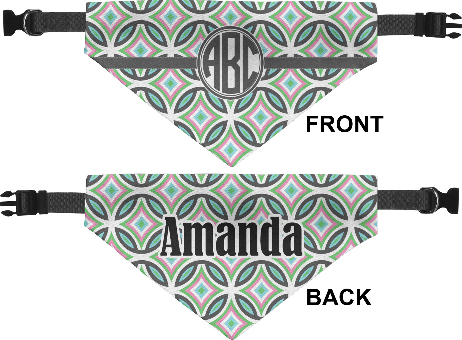 We print the front and back of these dog bandanas with your customized design. The bandana itself is made from a durable polyester, sewn together with a gap large enough to accommodate any collar. Regardless, the bandana includes a plain black, canvas collar with plastic snaps, that can easily be removed if desired. These dog bandana collars are available in four sizes: small, medium, large, and extra large. Please see our sizing chart for more information regarding the dimensions of each size.