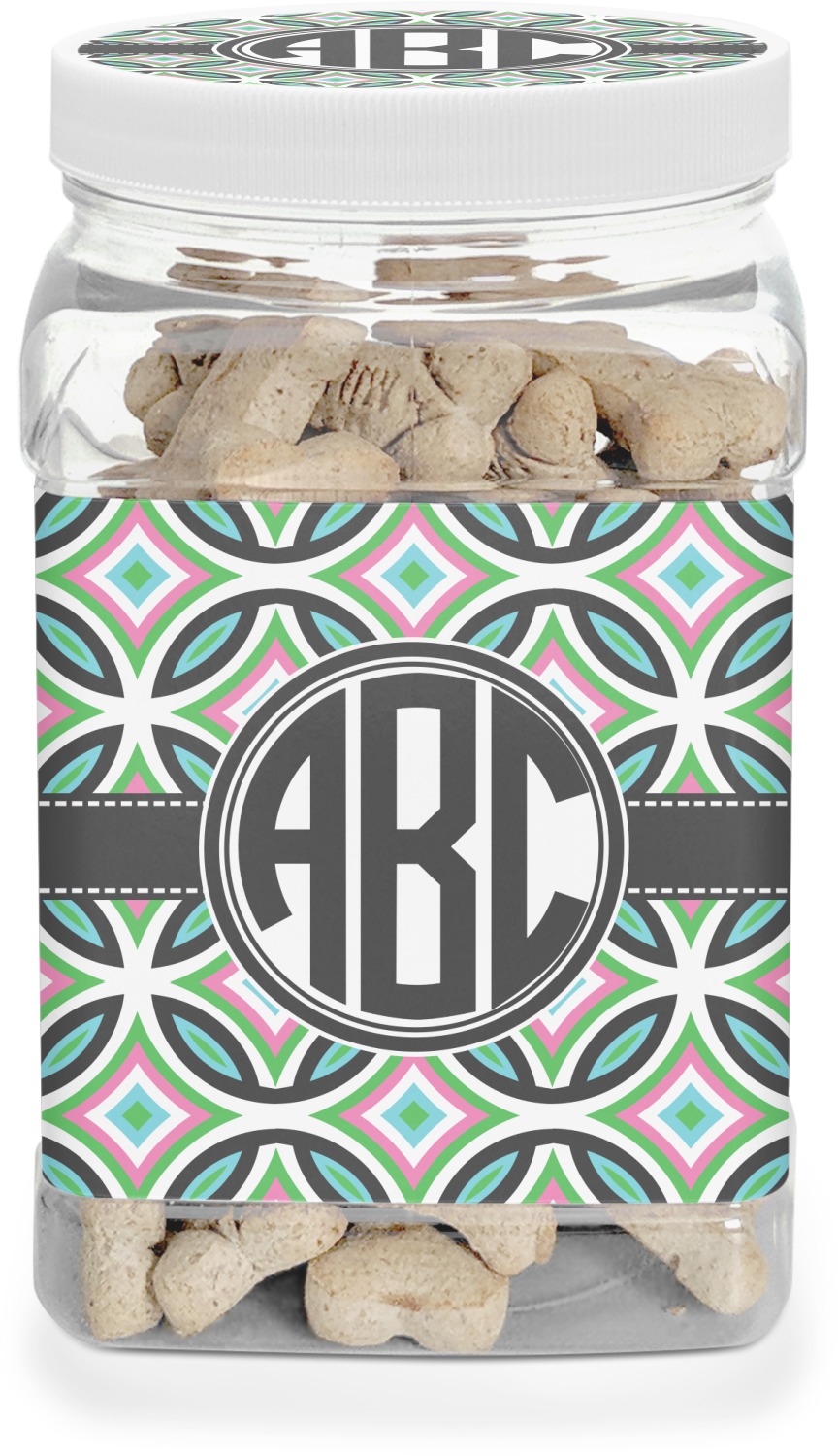 This half gallon jar, made from a sturdy plastic, is the perfect way to keep treats from any naughty pet paws, while still keeping them ready on hand for when your pup performs an impressive trick. This dog cookie jar features a screw-on, white lid that displays your personalized design on a vinyl sticker. We apply another customized sticker that wraps around the front and sides of the jar. Our dog treat jar also has indentations on the rear ends of the sides, which allows for convenient handling, and its square frame allows for easy storage.