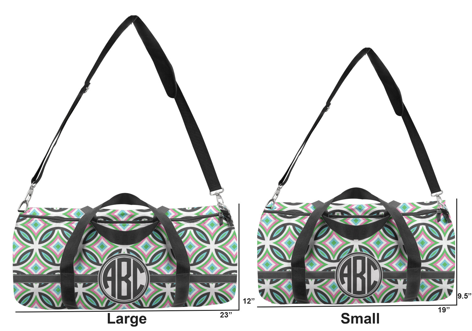 This duffle is a sturdy bag made of a canvas material. It comes in two sizes: Small (19"W x 9.5"H x 9.5"D) and Large (23"W x 12"H x 12"D). The bag is a cylindrical shape with a black adjustable strap and two handles. On one side is an elastic pouch to put a waterbottle or other small item. Your product will be sublimated with your design and is able to be designed on the front, back, and sides. Be sure to remember that the straps may cut into parts of your design if you upload your own artwork.