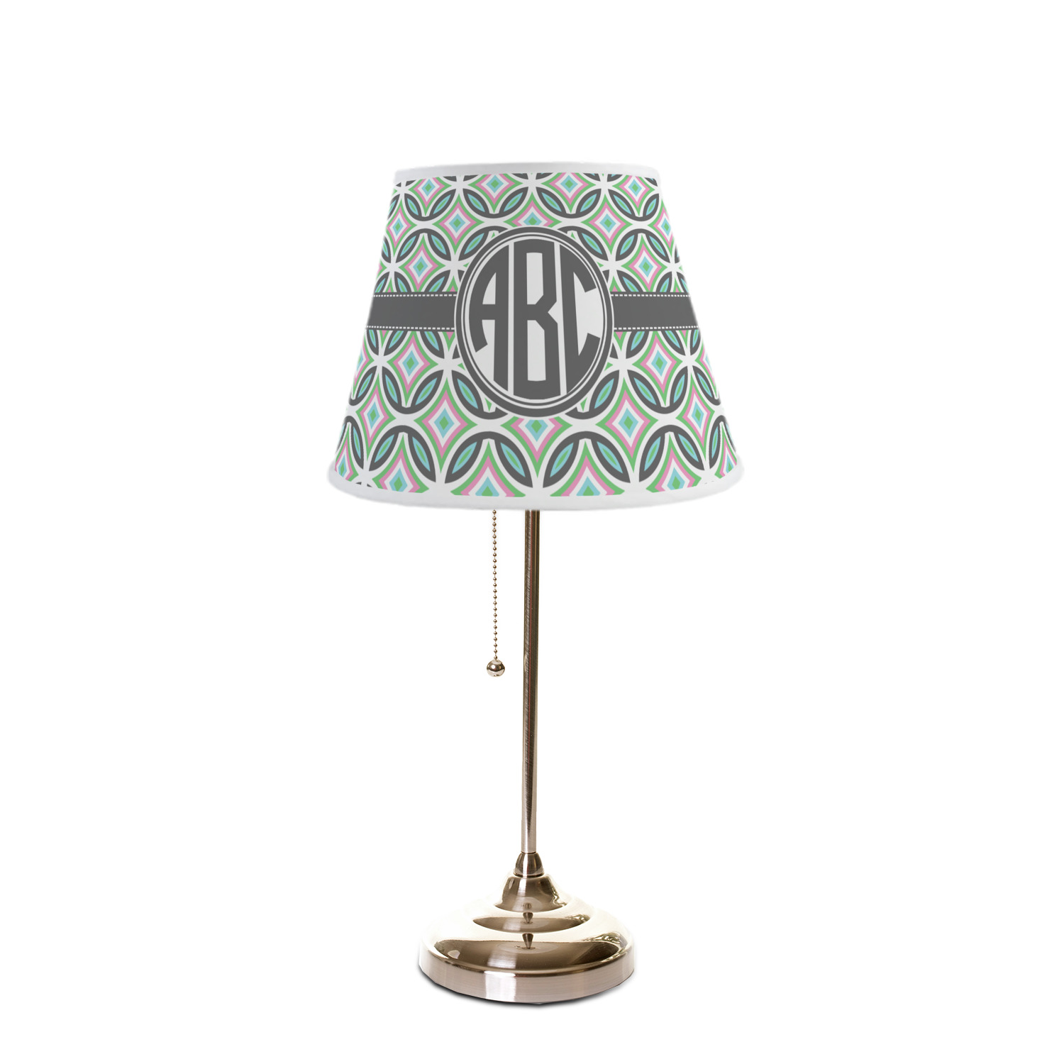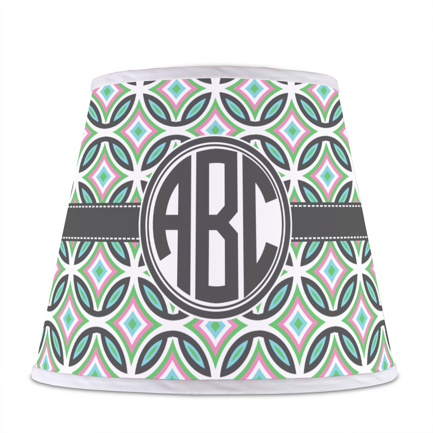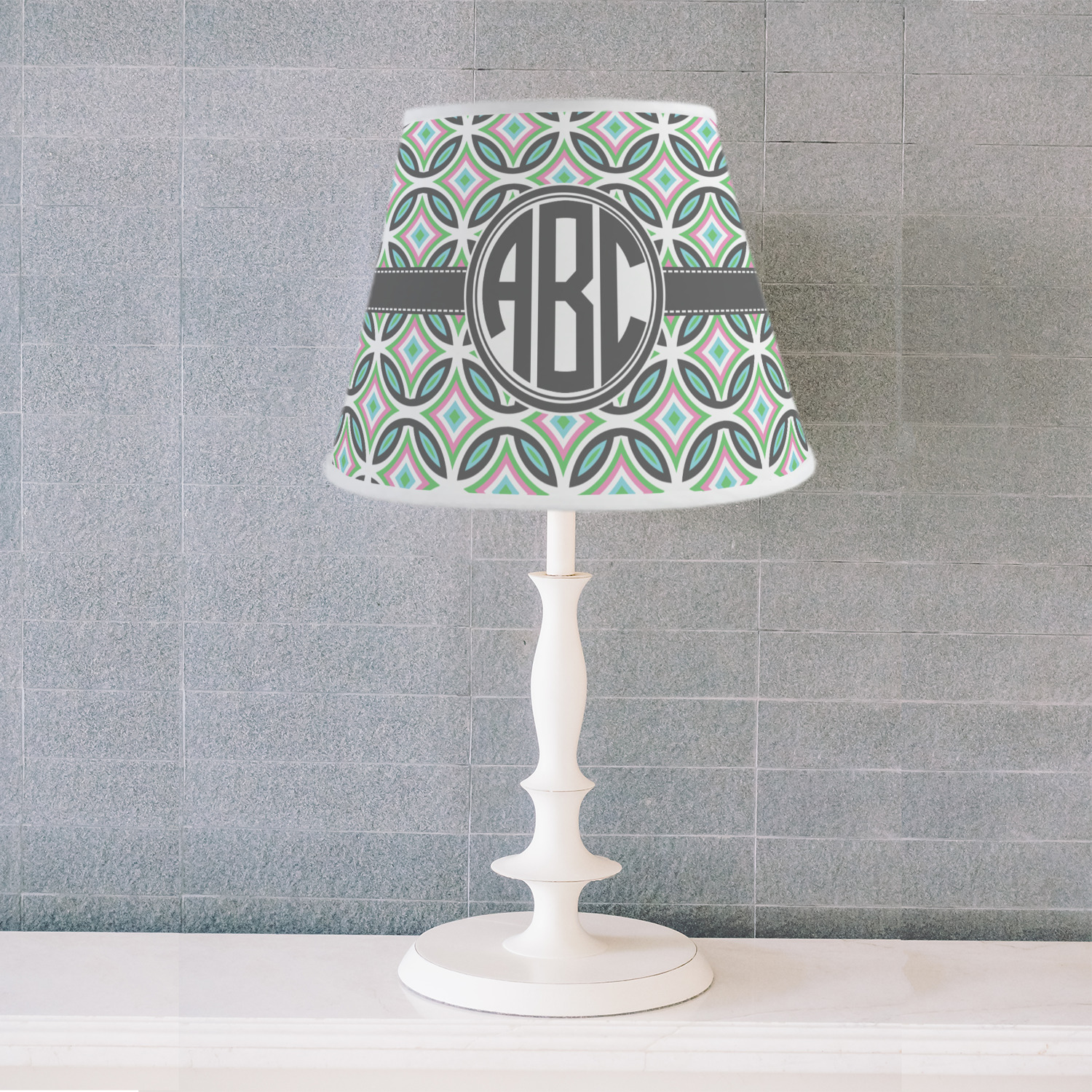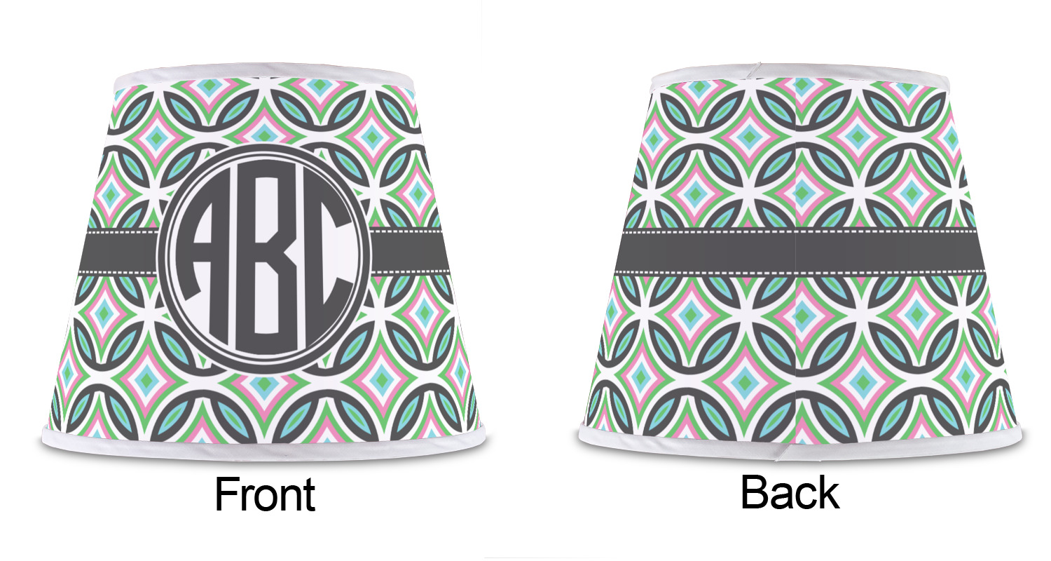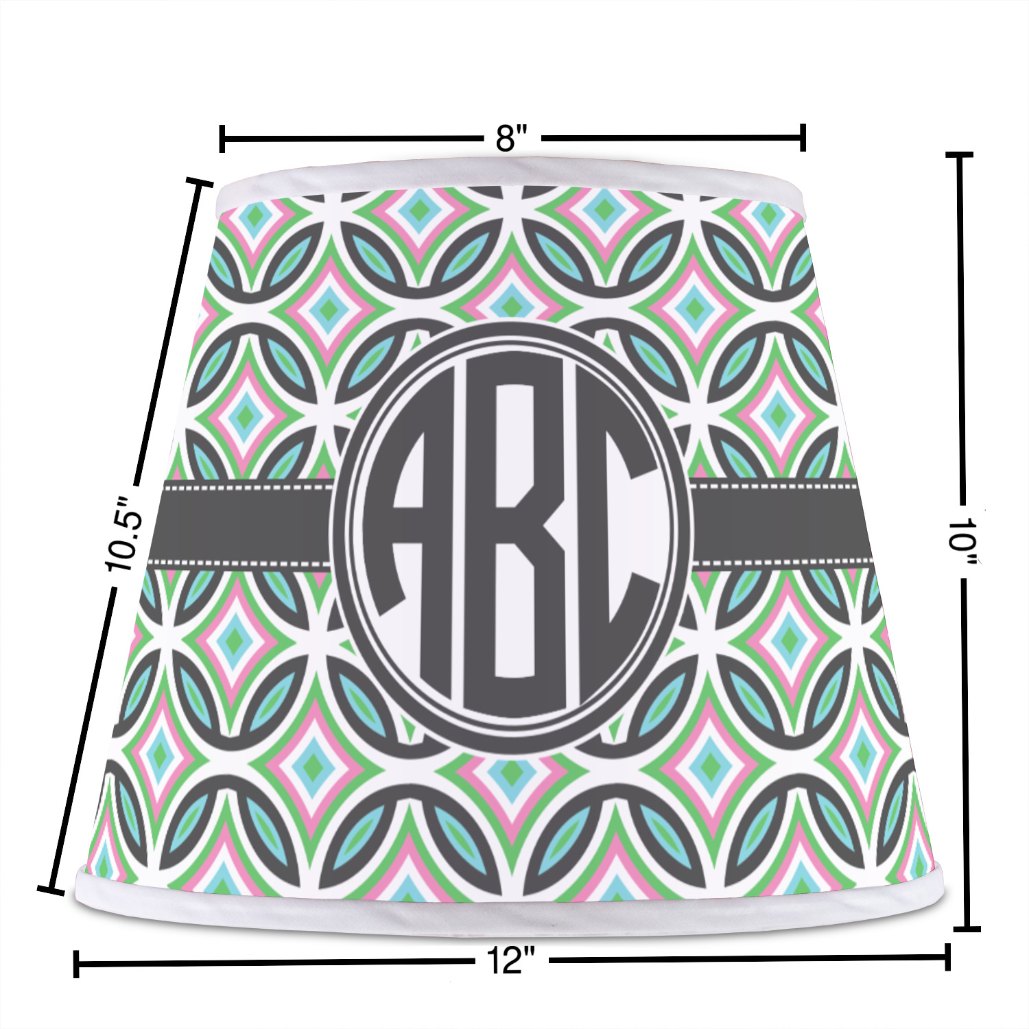 The base of this lampshade is 12 inches in diameter, and the top spans 8 inches in diameter. The total height of the lampshade is 10 inches. The angled nature of this custom lampshade concentrates the light, making it ideal for smaller spaces. This lampshade is made of matte, polyfilm, and displays your customization in its middle. The top and bottom of this colorful lamp shade are lined with a white fabric ribbon (which can be replaced with black inside the design studio) which frames your design and creates a sophisticated finish. As an UNO fitter lampshade, this unique lamp shade will fit a variety of bases.