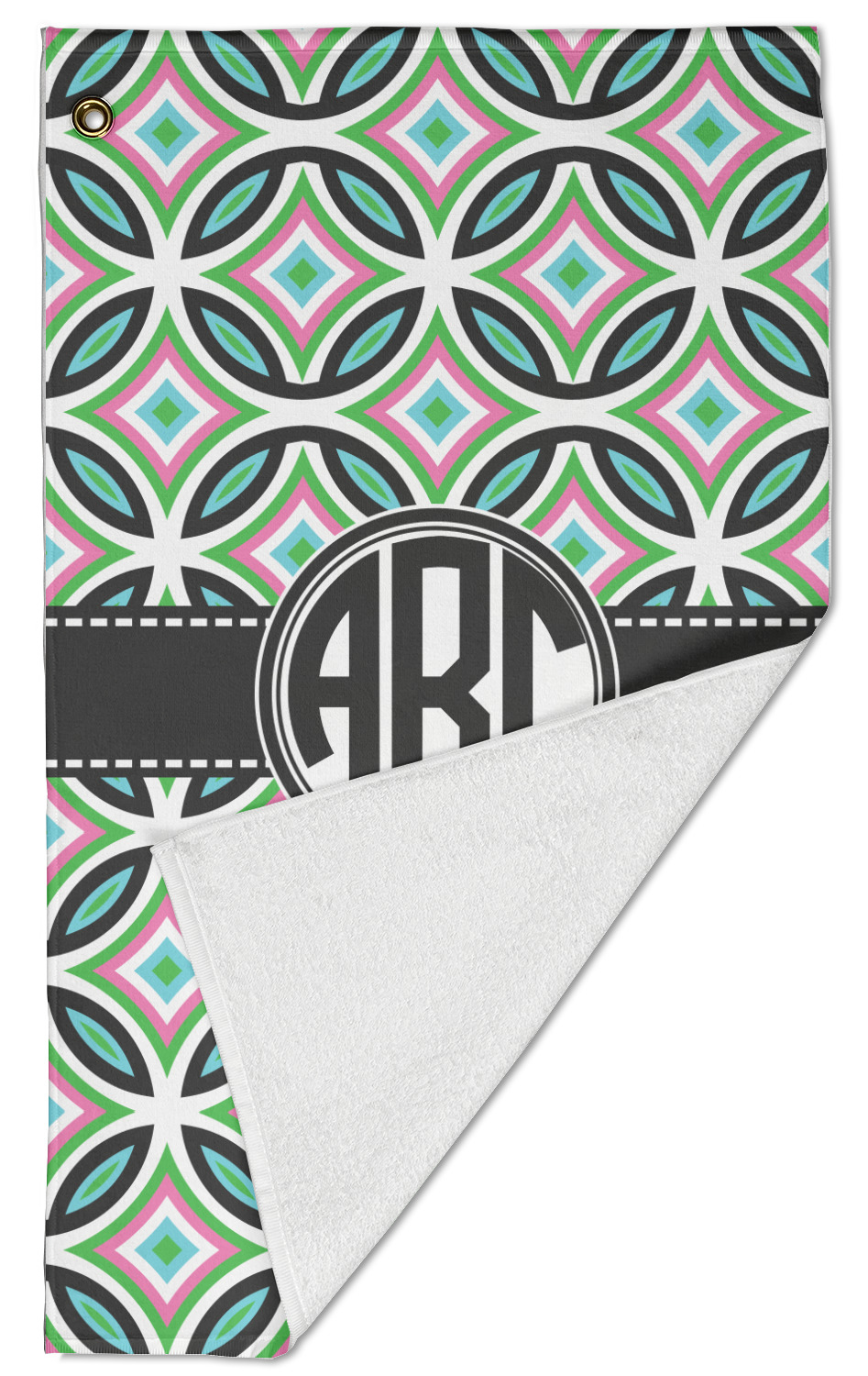 The towel is fully printed / patterned on the front polyester side; and is white on terrycloth cotton backside. The towel has grommet and a pear spring clip in the top left corner. Our golf towels are available in 100s of different prints and patterns.