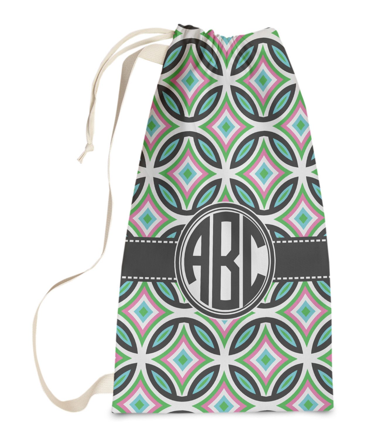 Carry your laundry in style with these customized laundry bags. Available in two sizes, featuring a natural colored woven strap and a cinch cord, these bags hold a lot of clothes or anything else you want to fit in them.
