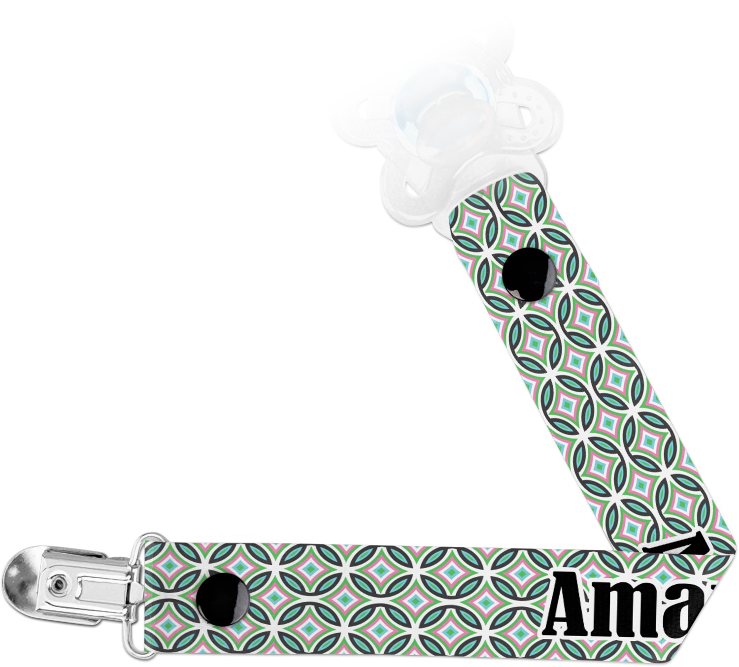 This personalized pacifier clip is the ideal size and measures at approximately 7.5 inches in length, when either end is snapped closed. On one end, you'll find a snap button. This button of your baby's pacifier holder is what can be attached to their pacifier to hold is securely in place. Simply open the snap, slip it through the pacifier opening, and snap it back into place. On the opposite end of this baby pacifier holder, you'll find a metal clip that can secure to a baby's collar or sleeve. This clip ensures that the strap stays in place, and that your baby's pacifier is always on hand.