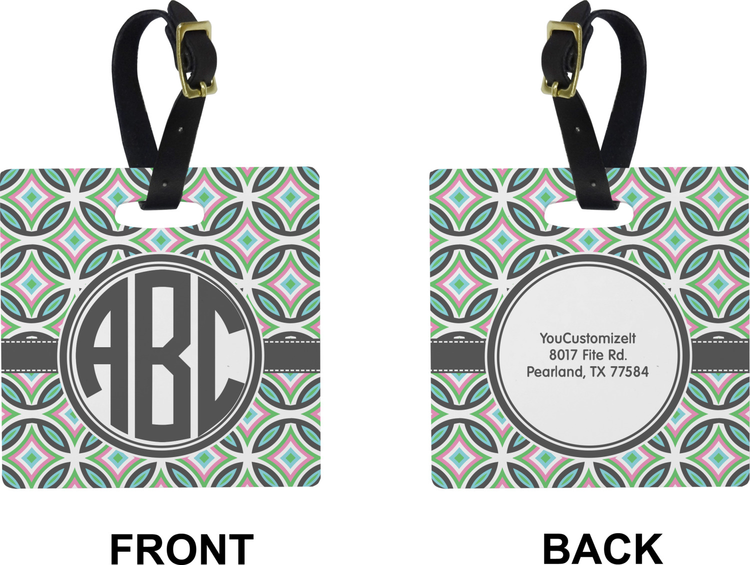 These personalized bag tags are sold in a variety of shapes, so that you may find the product that meets your vision exactly. We sell a round luggage tag, which measures at approximately 4" x 4". Our square luggage tag is about 3.5" x 3.5", while our rectangular version is 2.75" x 4 ".