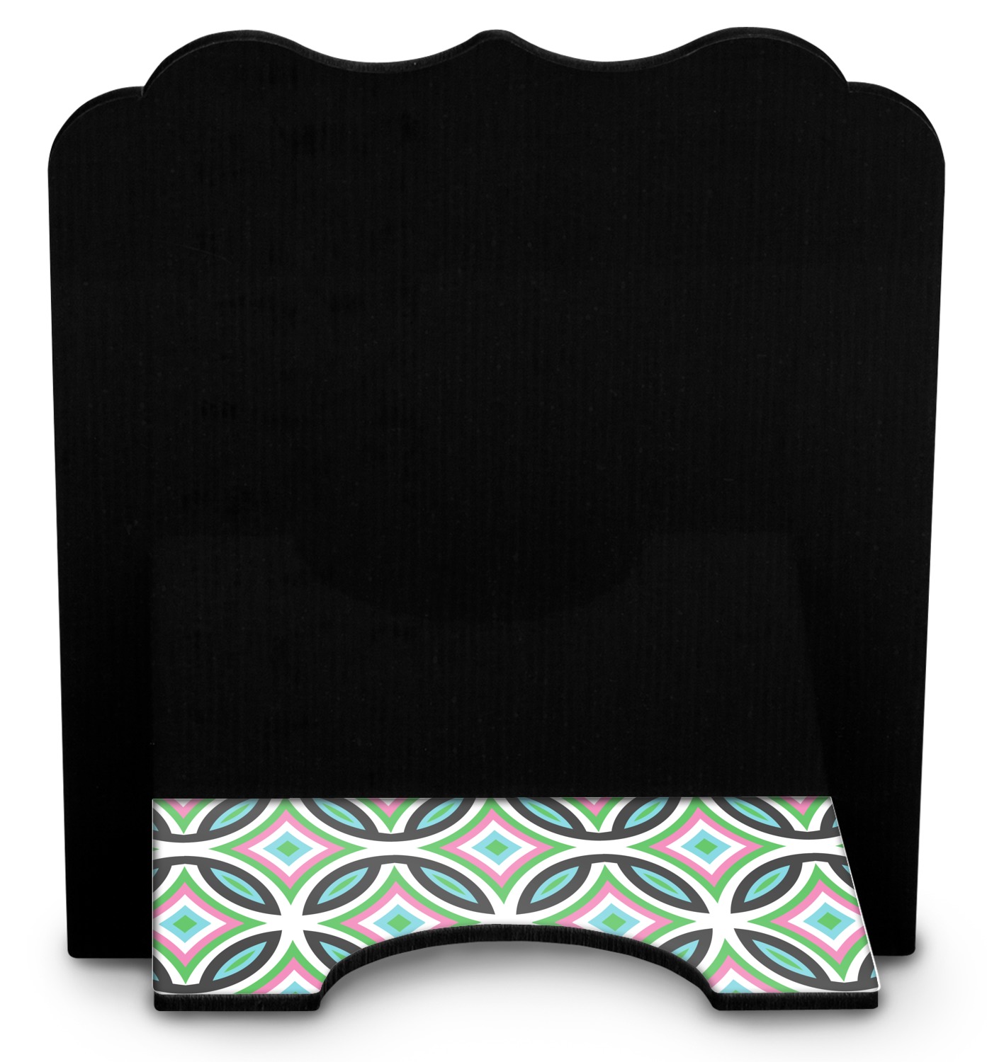 The stand is comprised of two hardboard pieces that fit snugly together and stabilize one another. The bottom part of the iPad stand supports your tablet, and has space for your tablets charger while in use. At 9.25" x 11.5", this tablet mount can support a device between the sizes of the iPad Pro and the iPad Mini 2. The uppermost part of the stand features a decorative, curved edge for a classy, suave appearance. We print your customization atop the face of the stand, in vibrant color. The remaining sides are colored a sleek black.