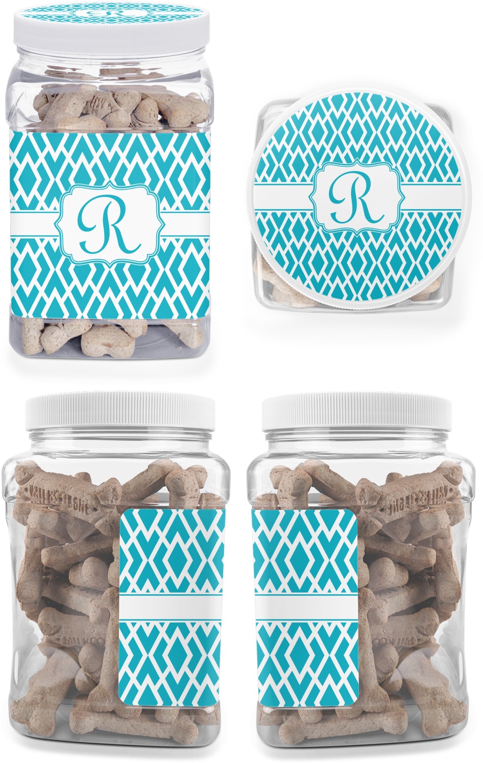 This half gallon jar, made from a sturdy plastic, is the perfect way to keep treats from any naughty pet paws, while still keeping them ready on hand for when your pup performs an impressive trick. This dog cookie jar features a screw-on, white lid that displays your personalized design on a vinyl sticker. We apply another customized sticker that wraps around the front and sides of the jar. Our dog treat jar also has indentations on the rear ends of the sides, which allows for convenient handling, and its square frame allows for easy storage.