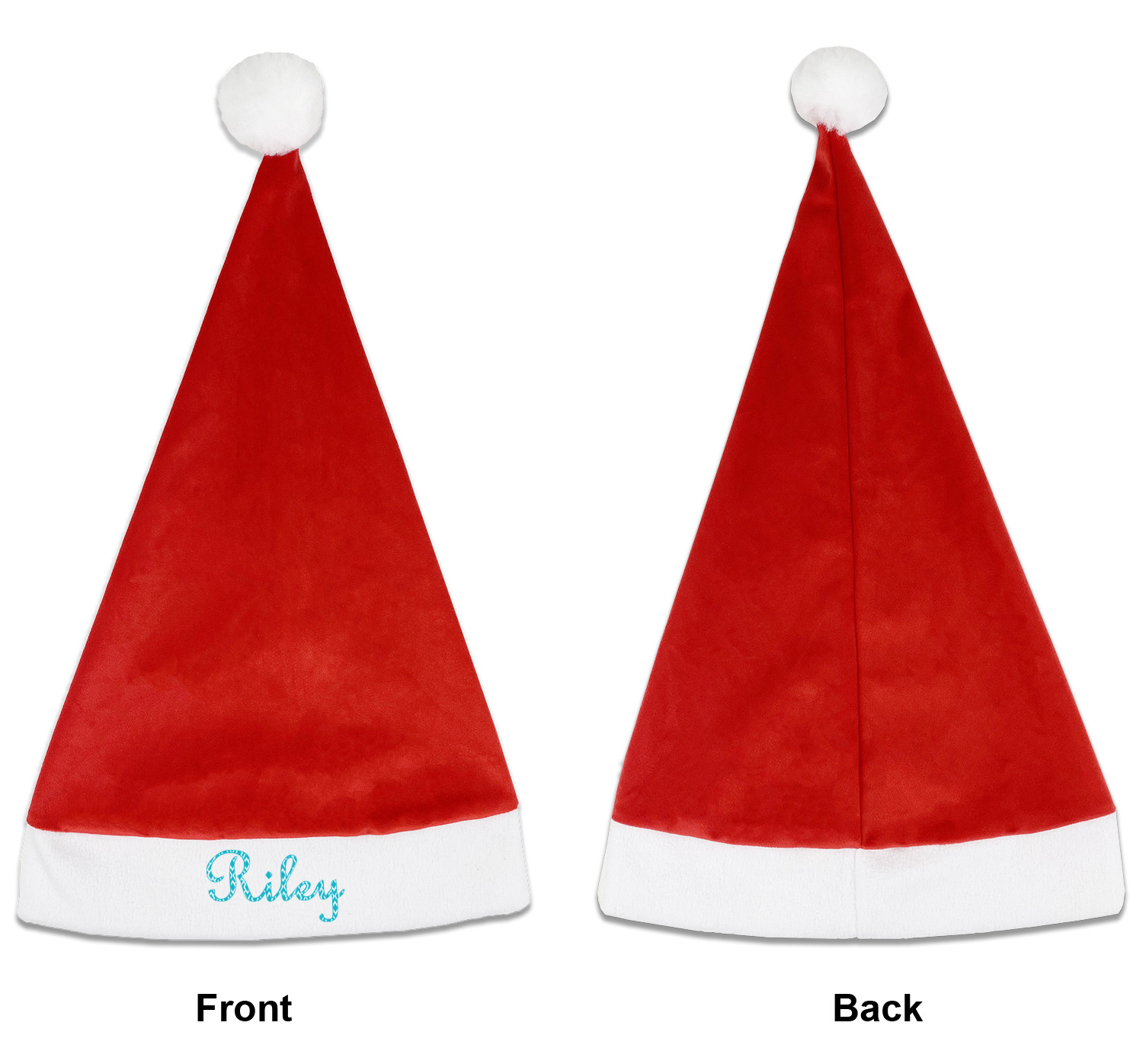 Our Santa hats are a soft, velvety polyester material. These customizable Santa hats are a classic red with white brimming and pom pom ball hanging off the hat tail just like Santa Claus! Each personalized Santa hat is approximately 17.5 L x 11.8 W. We offer two different styles to print your designs on the white brim - front or front & back.