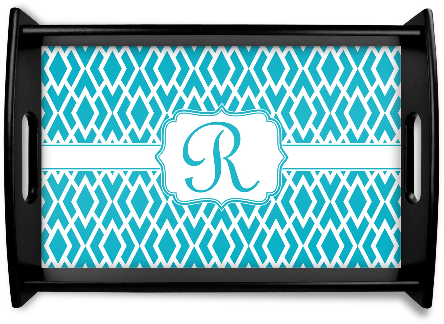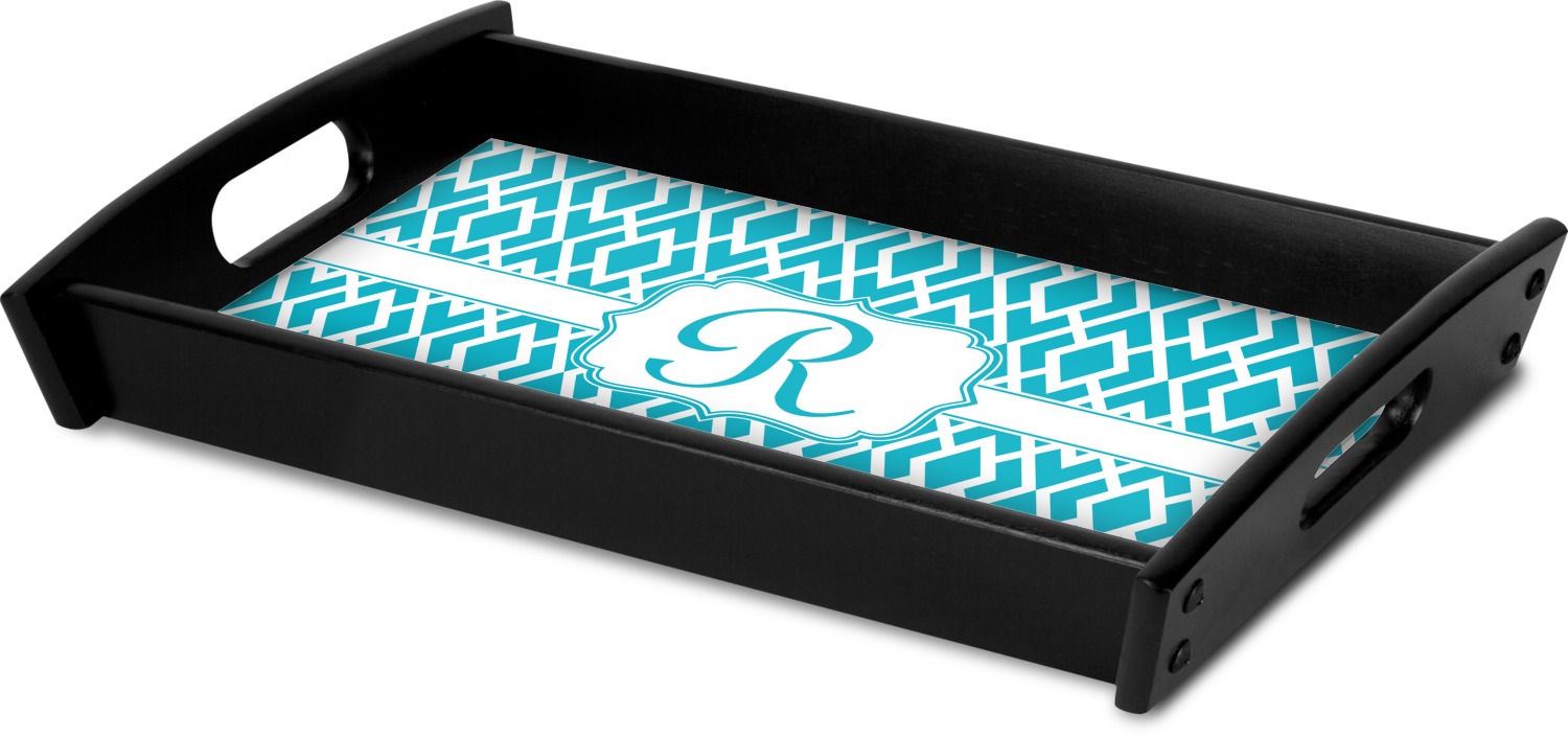 This serving tray with handles features square edges and two rounded sides, creating a very modern look. Each side is fabricated from a beautifully cut, natural wood. The bottom of the interior of the tray displays your customized design in bright, vibrant color. The tray is sold in both a black color and a natural wood look. Each variation of the wood serving tray has two sizes: Small, which is 14" x 10" x 2.25", and Large, which is 19.5" x 13.5" x 2.75".