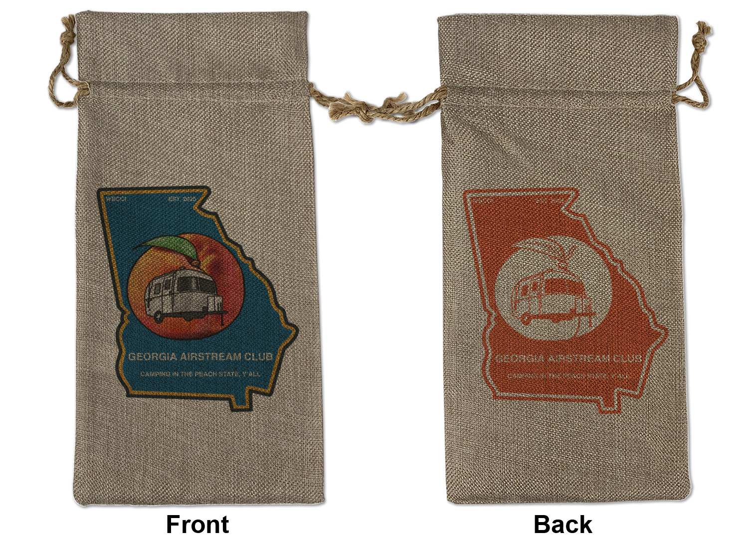 We sell our Burlap Gift Bags in 3 variant sized bags. Made with burlap polyester, each personalized bag can be secured with a twine drawstring pull. Your custom design is available to print on one side or both sides - completely up to you! The sizes of the bags measure approximately 4.5" x 6.5" for the smallest size, 6.5" x 8.0" for the medium size, and 6.5" x 13.5" for the large-sized bag.