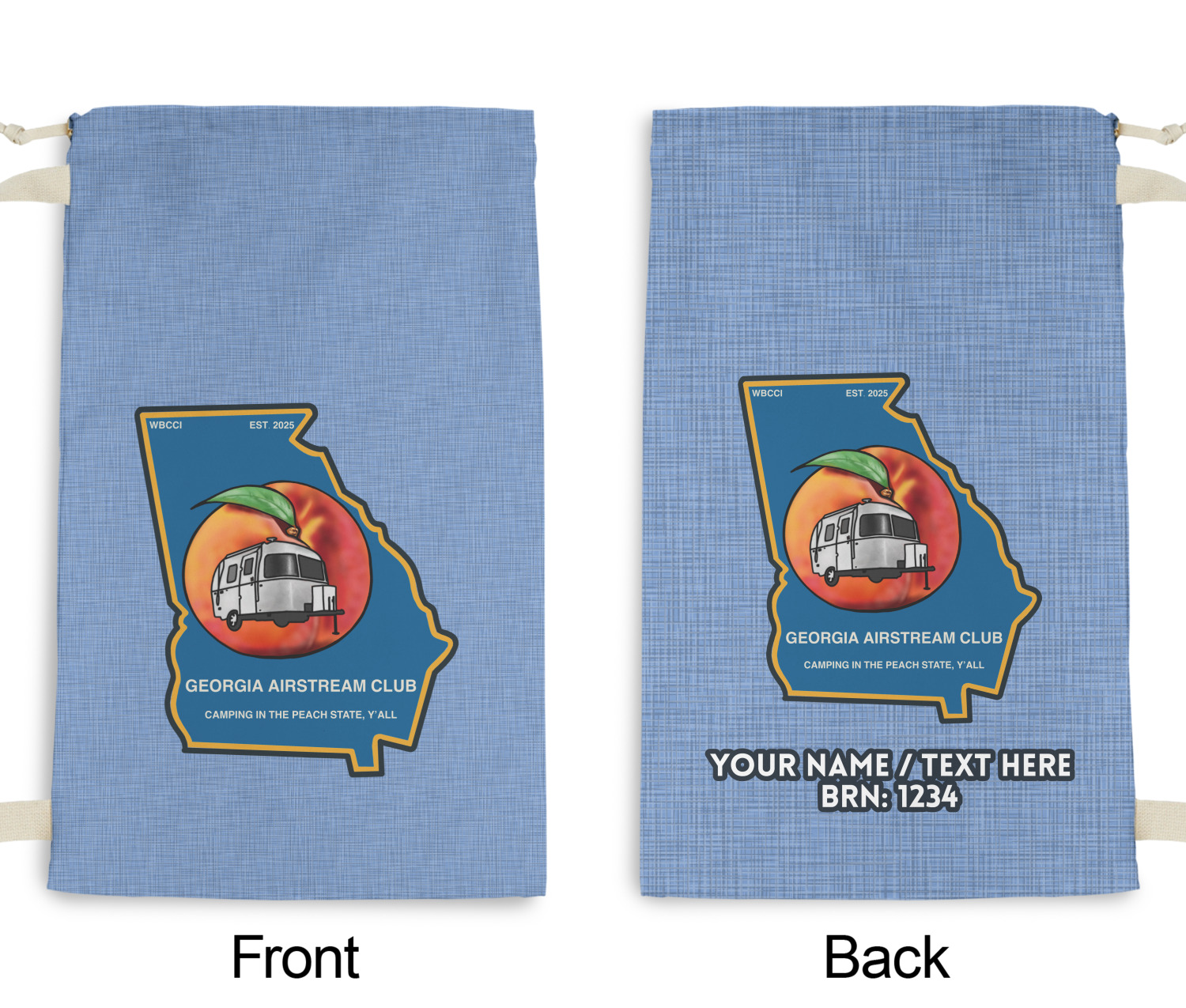 Carry your laundry in style with these customized laundry bags. Available in two sizes, featuring a natural colored woven strap and a cinch cord, these bags hold a lot of clothes or anything else you want to fit in them.