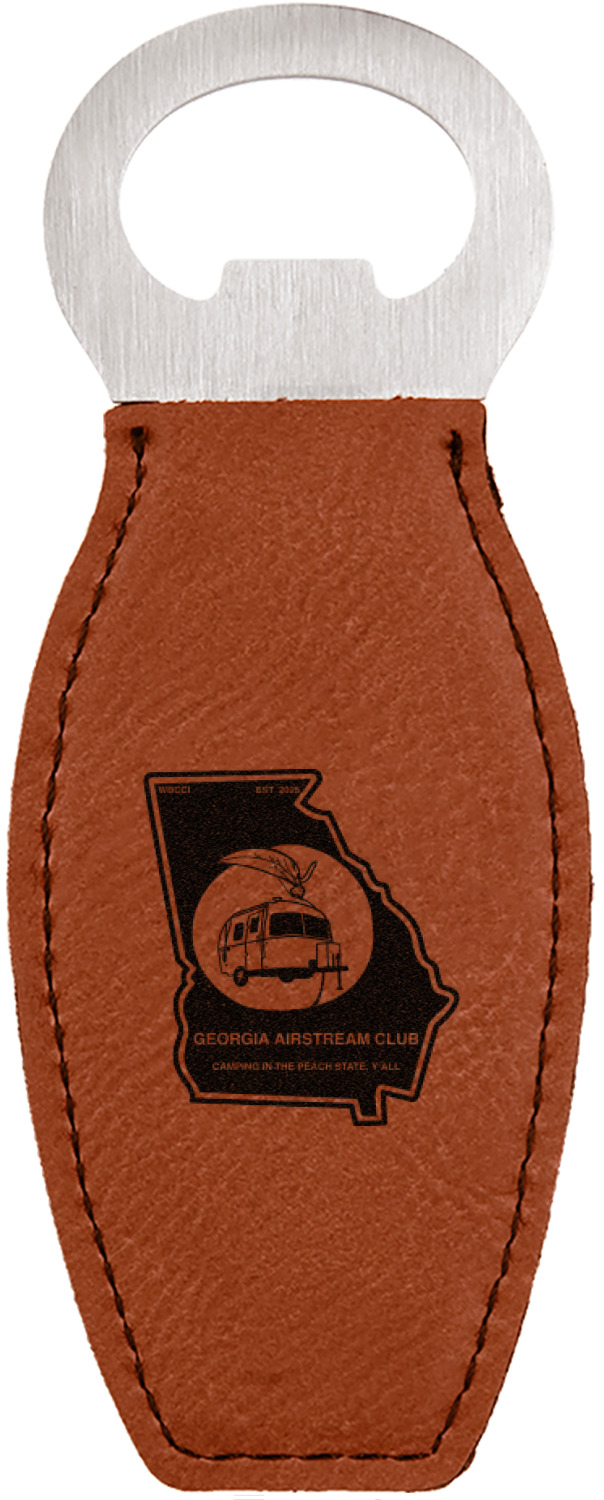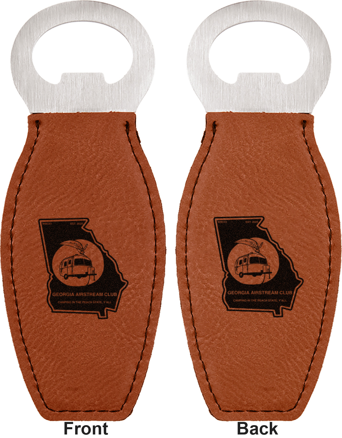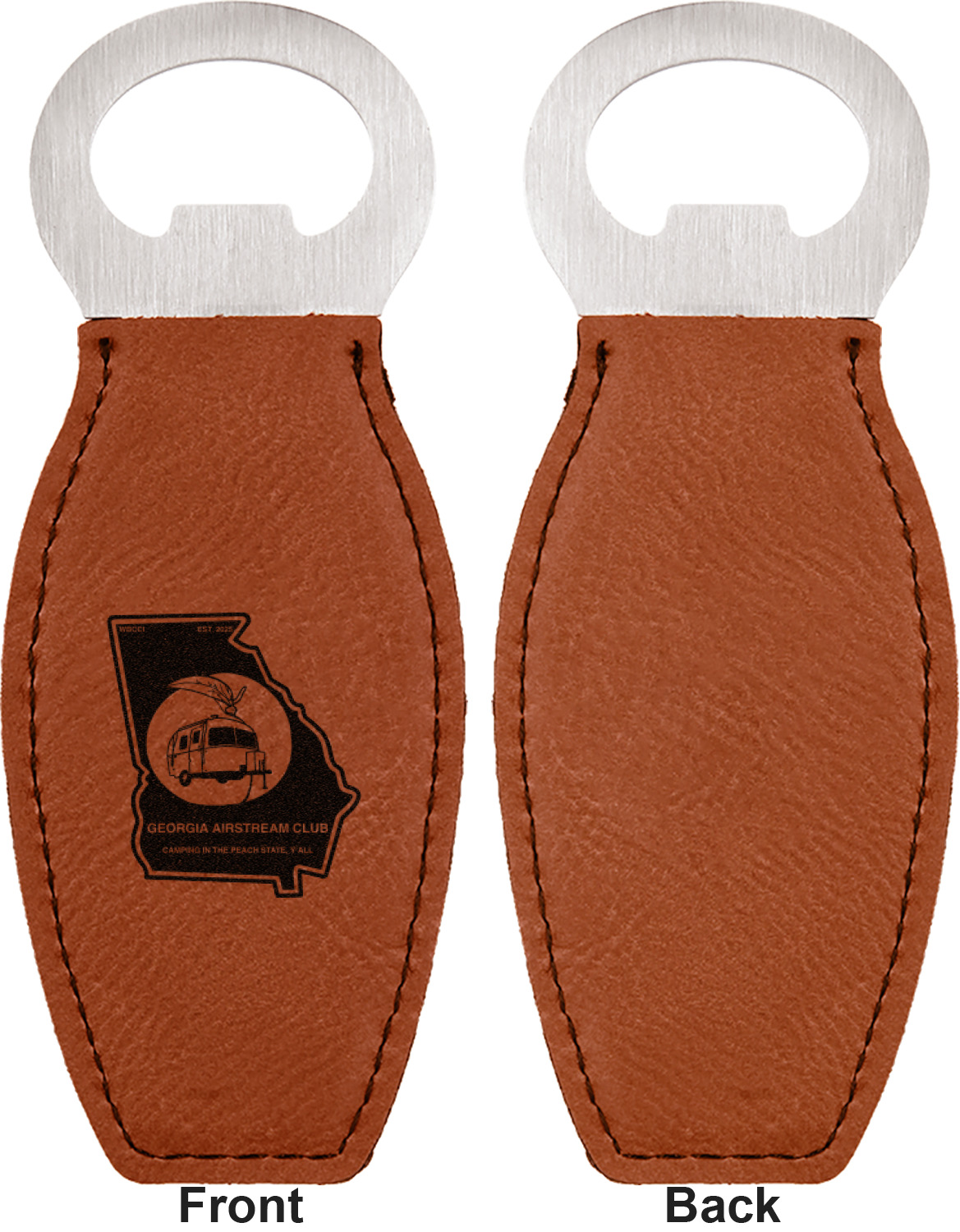 Built from stainless steel, these custom bottle openers are wrapped in a cognac-colored leatherette. Sharp, black stitching lines the edges for extra durability and a finished touch. Your personalization is laser-engraved onto the surface of this leatherette, leaving behind a crisp, black coloration. At 4.6 by 1.8 inches, this beer bottle opener gives you much of leverage when trying to open a stubborn bottle. On the opposite end of the opener, you'll find a magnet that you can use to display your new, unique bottle opener!