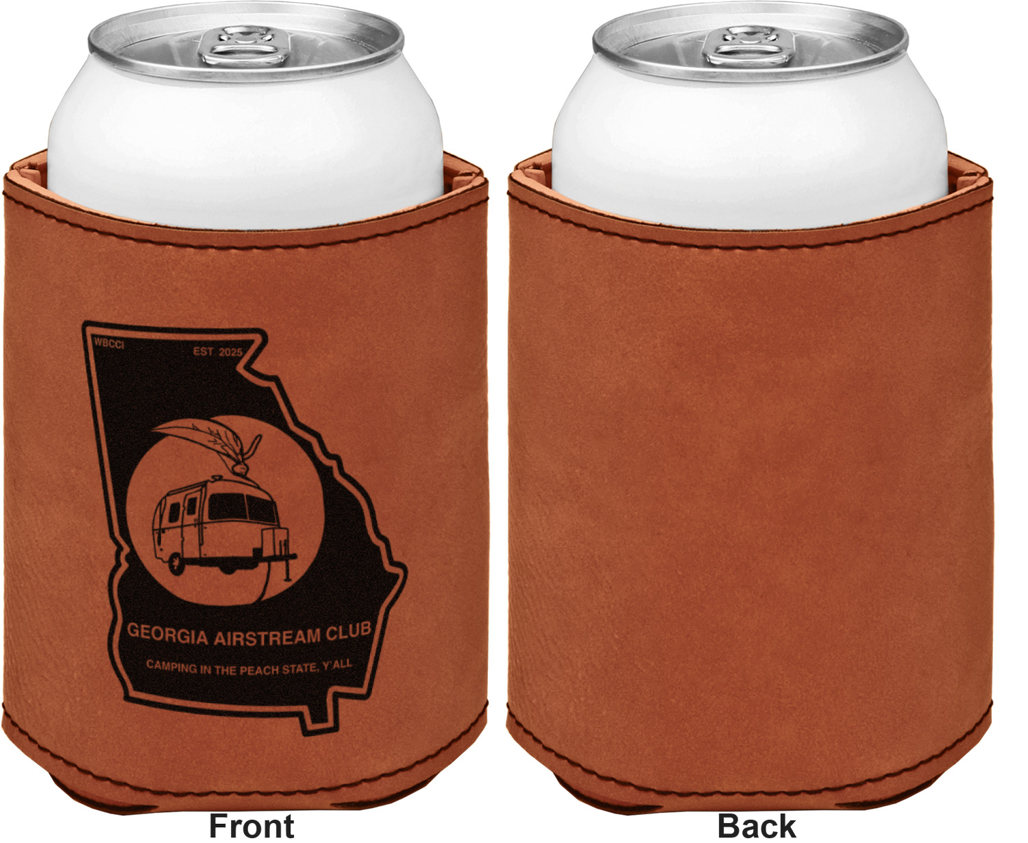 This can sleeve is made from a cognac-brown leatherette and stitched with a sturdy, black thread. A slim padding lines the inside of your can sleeve to allow for a better fit once your drink is inserted. The sleeve itself measures at 4 by 4.5 inches, allowing this custom can sleeve to accommodate most canned drinks. Your personalized design can be engraved on the front and back, or solely the front. When laser-engraved, your design appears as a black coloration which contrasts the leatherette nicely.