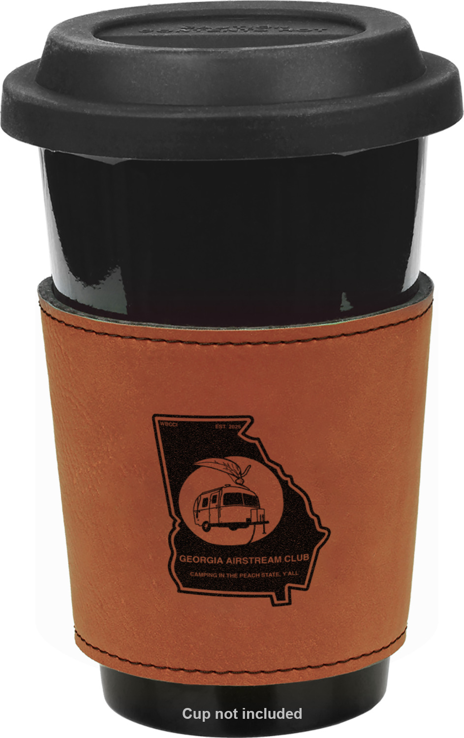 This cup sleeve is made from a suave, cognac-brown leatherette and finished with an intricate, black stitch. The interior of this can sleeve is fabricated from a thin foam material to help insulate your mug's contents. The sleeve is specifically made to suit tapered glasses or mugs, so the top's diameter is 3.5 inches, while the bottom's diameter is 2.75 inches. Your customized design will be laser engraved into the leatherette, leaving behind crisp, black imprint. With these products, we provide you with the option of engraving the front and back, or the front only.