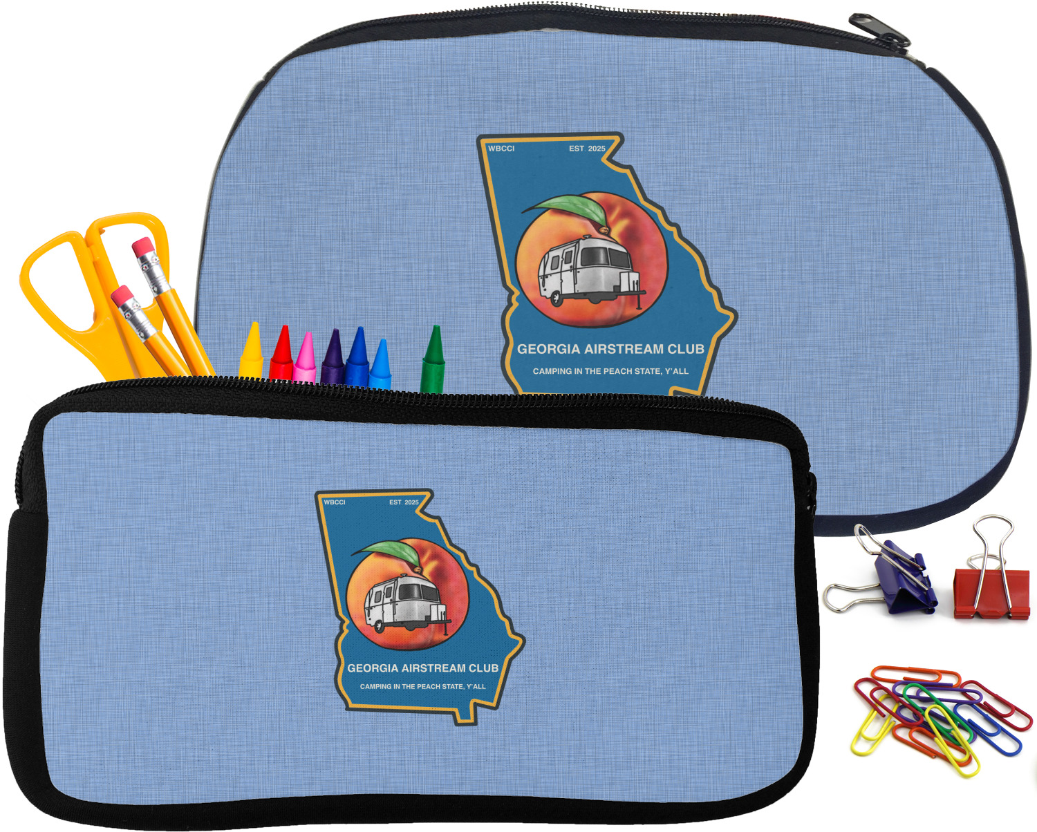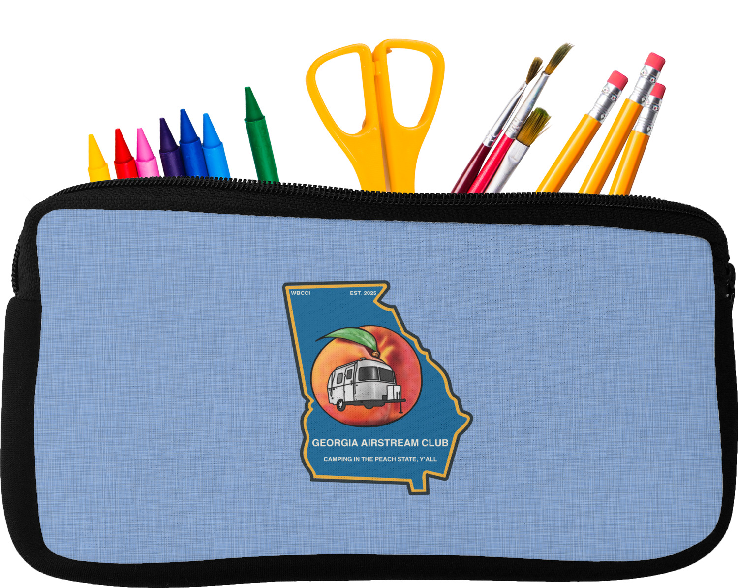 Built from durable neoprene, these pencil pouches, are water resistant, and prevent leaking ink from spilling into your backpack or purse. These custom pencil cases secure with a robust, black zipper. We print your personalized design on the front of this pouch, while the remaining sides a simple black color. These colored pencil cases [880] are sold in two sizes; our smaller version measures at 8.5 by 4.5 inches, while the medium measures at 10.5 by 6.5 inches. The smaller size is more suitable for holding pencils and pens, while our medium size can accommodate pencil sharpeners, scissors, and erasers.