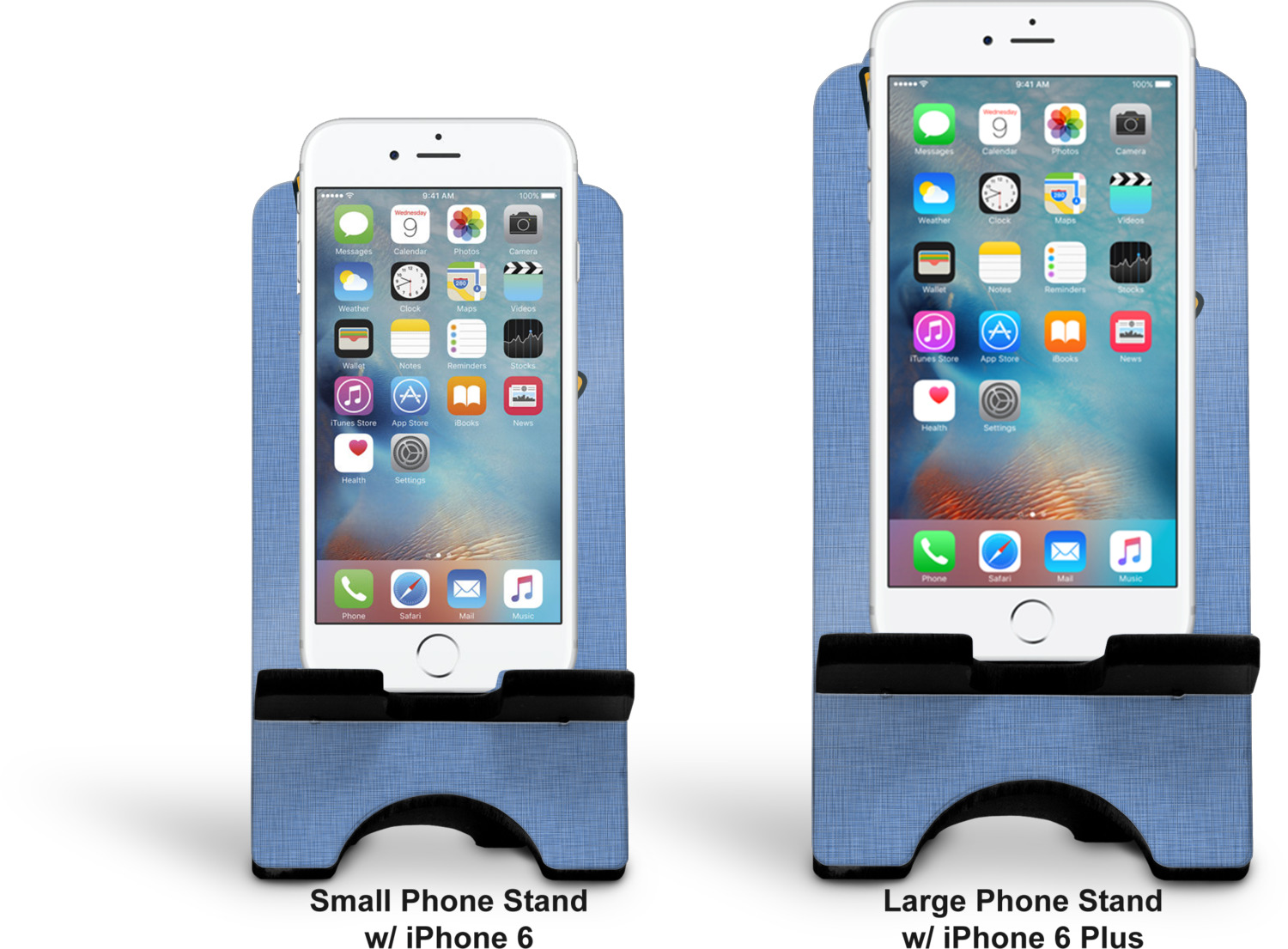 To meet your needs, we offer four variations of this IPhone stand. The backboard of the first version is shaped as a plain, yet sleek rectangle, and is available in two sizes. Our smaller size is approximately 4 by 3.25 by 7 inches, while the larger model is 4 by 3.77 by 8.5 inches. Alongside this model, we also provide you with a more decorative option. The upper part of our second version features a curved edge, for a classy, suave appearance. This phone holder is also sold in two sizes: a smaller version, which is 4 by 3.25 by 7 inches, and our larger model, which is 4 by 3.77 by 8.5 inches. Both models will support large phones, but the larger model is better if you wish to proudly display your personalized design.