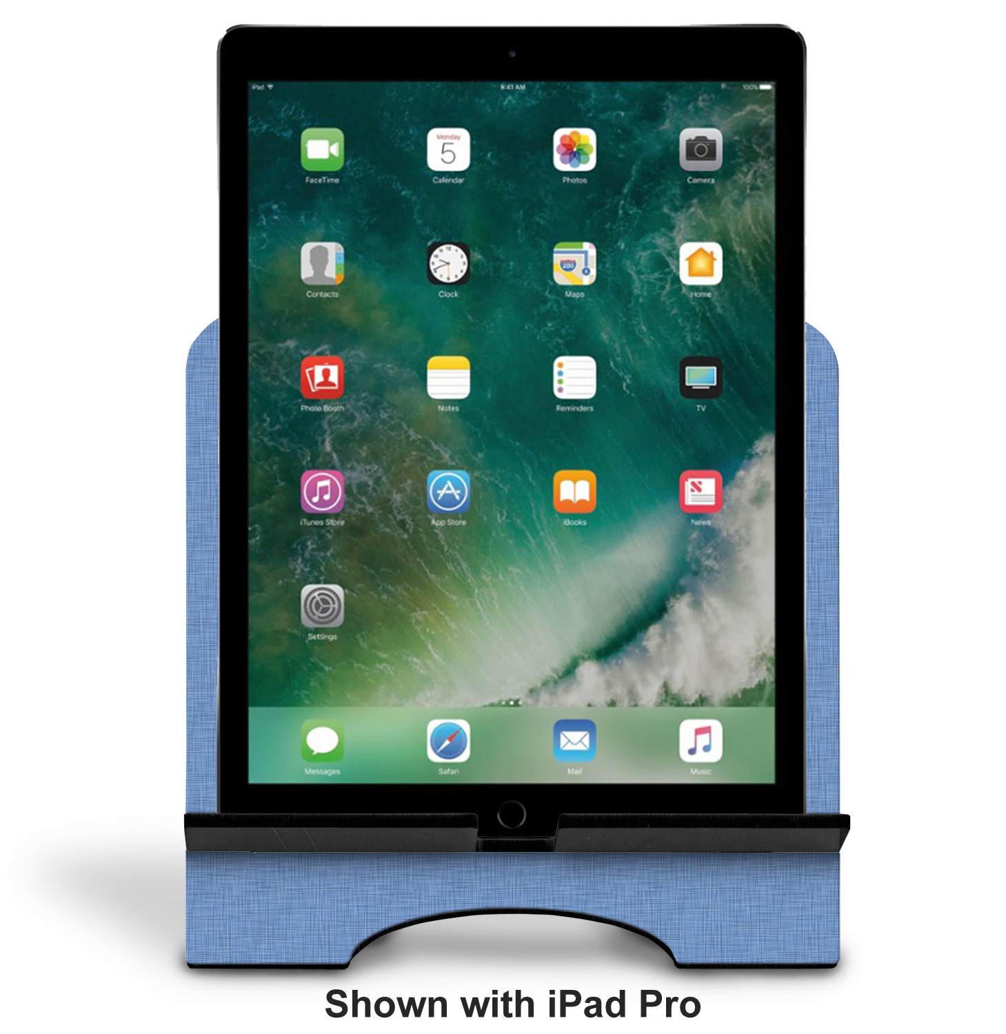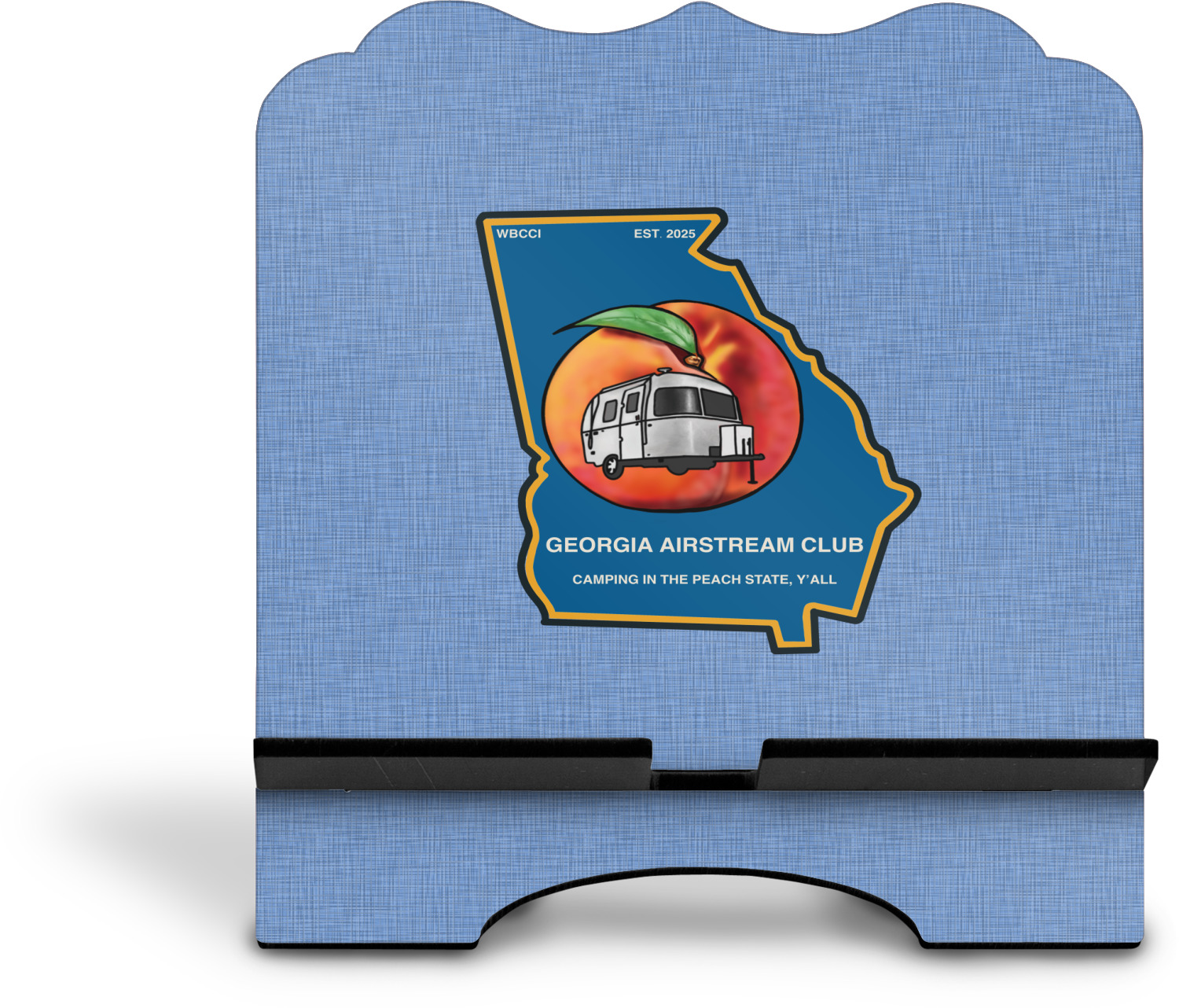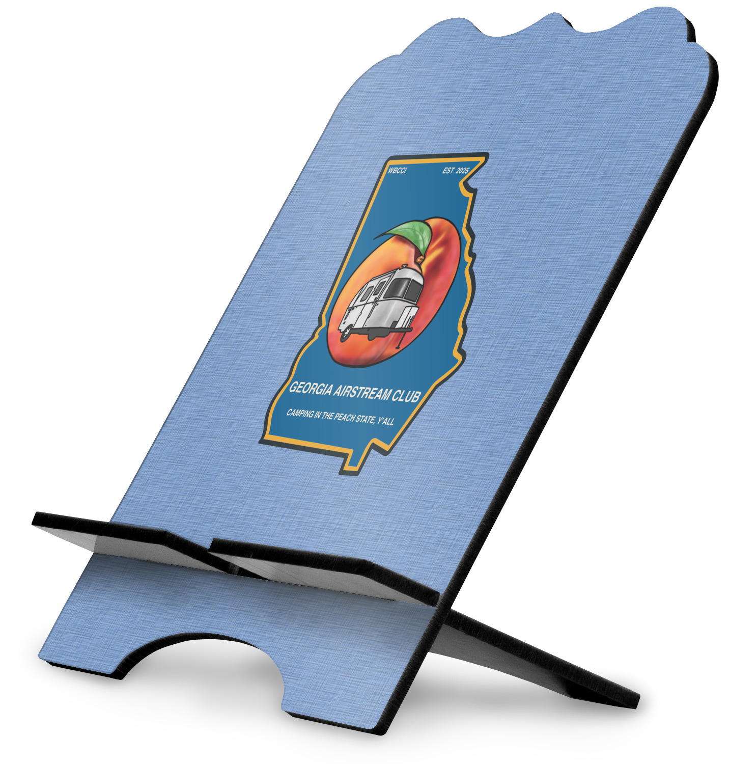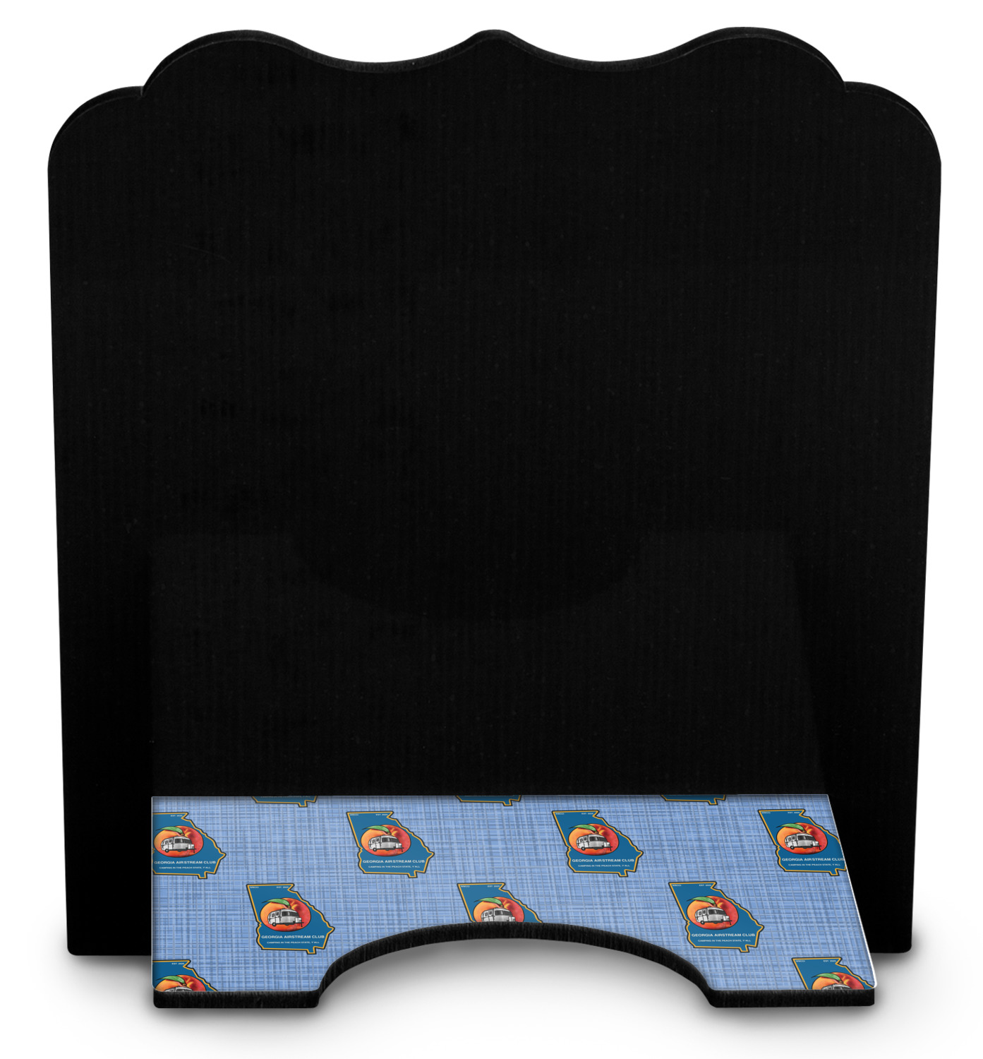 The stand is comprised of two hardboard pieces that fit snugly together and stabilize one another. The bottom part of the iPad stand supports your tablet, and has space for your tablets charger while in use. At 9.25" x 11.5", this tablet mount can support a device between the sizes of the iPad Pro and the iPad Mini 2. The uppermost part of the stand features a decorative, curved edge for a classy, suave appearance. We print your customization atop the face of the stand, in vibrant color. The remaining sides are colored a sleek black.
