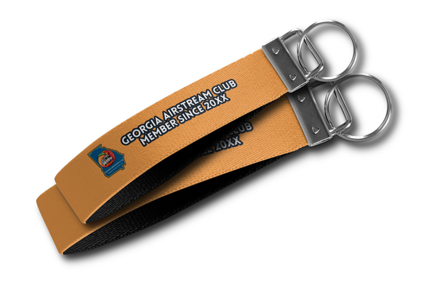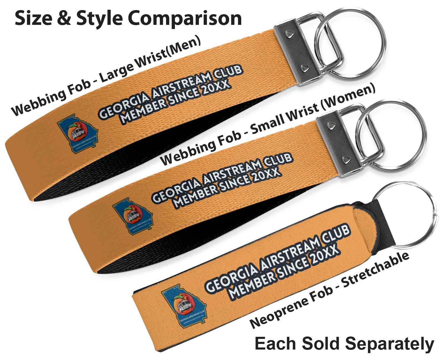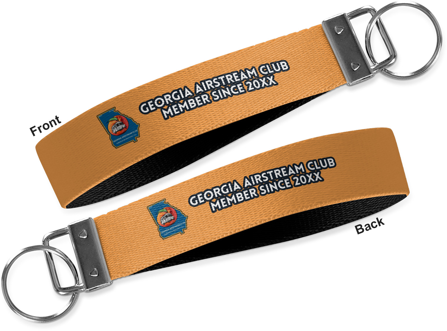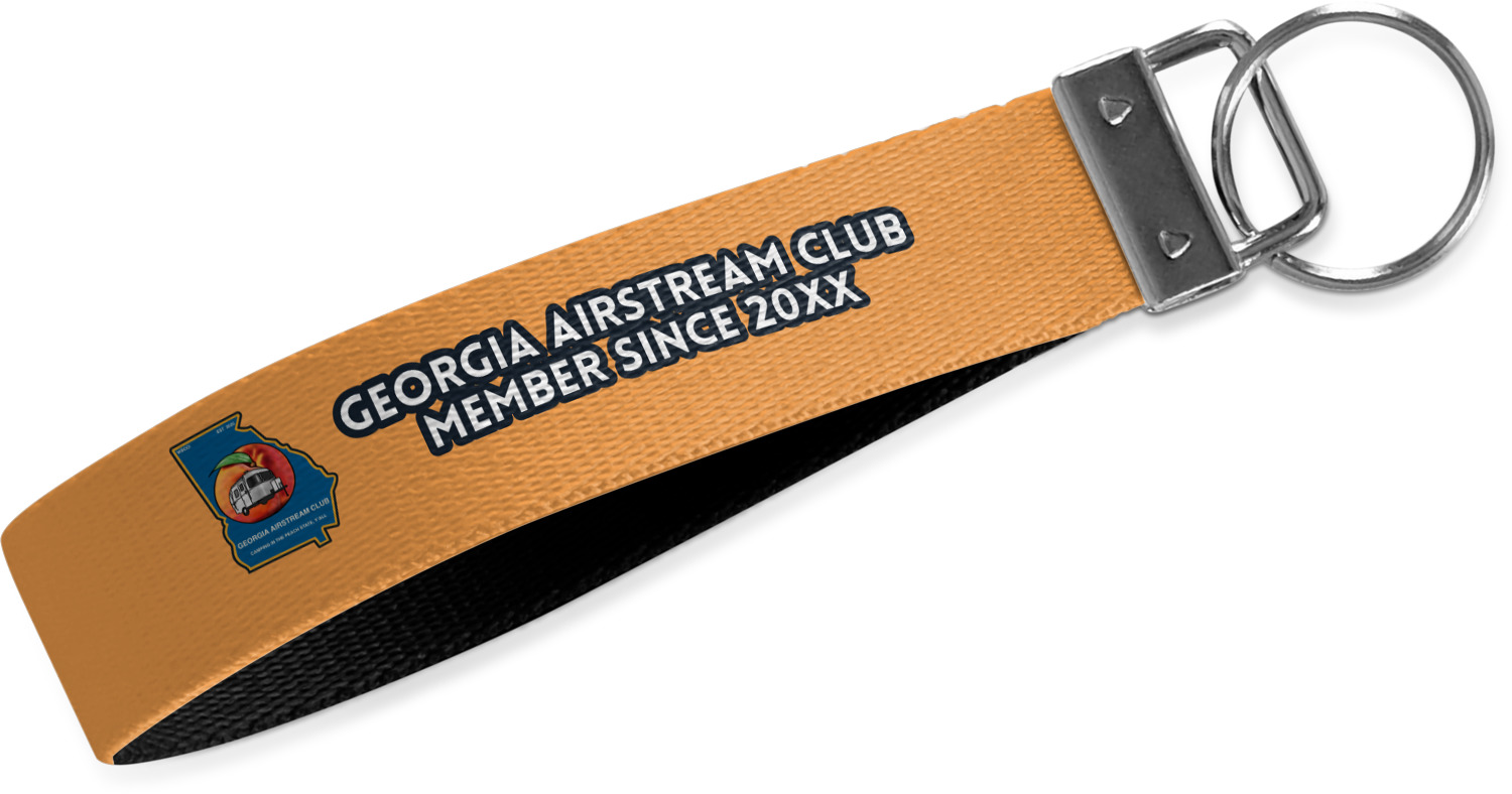 These key fob keychains are made from a polyester weave, right here in the USA. They feature a silver, metal clasp, attached to a round keyring. The piece gives the personalized wristlet a beautiful, finished look. Your customized design is printed on the outside of the keychain strap. We carry these wristlets in two sizes: small, which is 5 inches in width, and large, which is 5.5 inches in width.