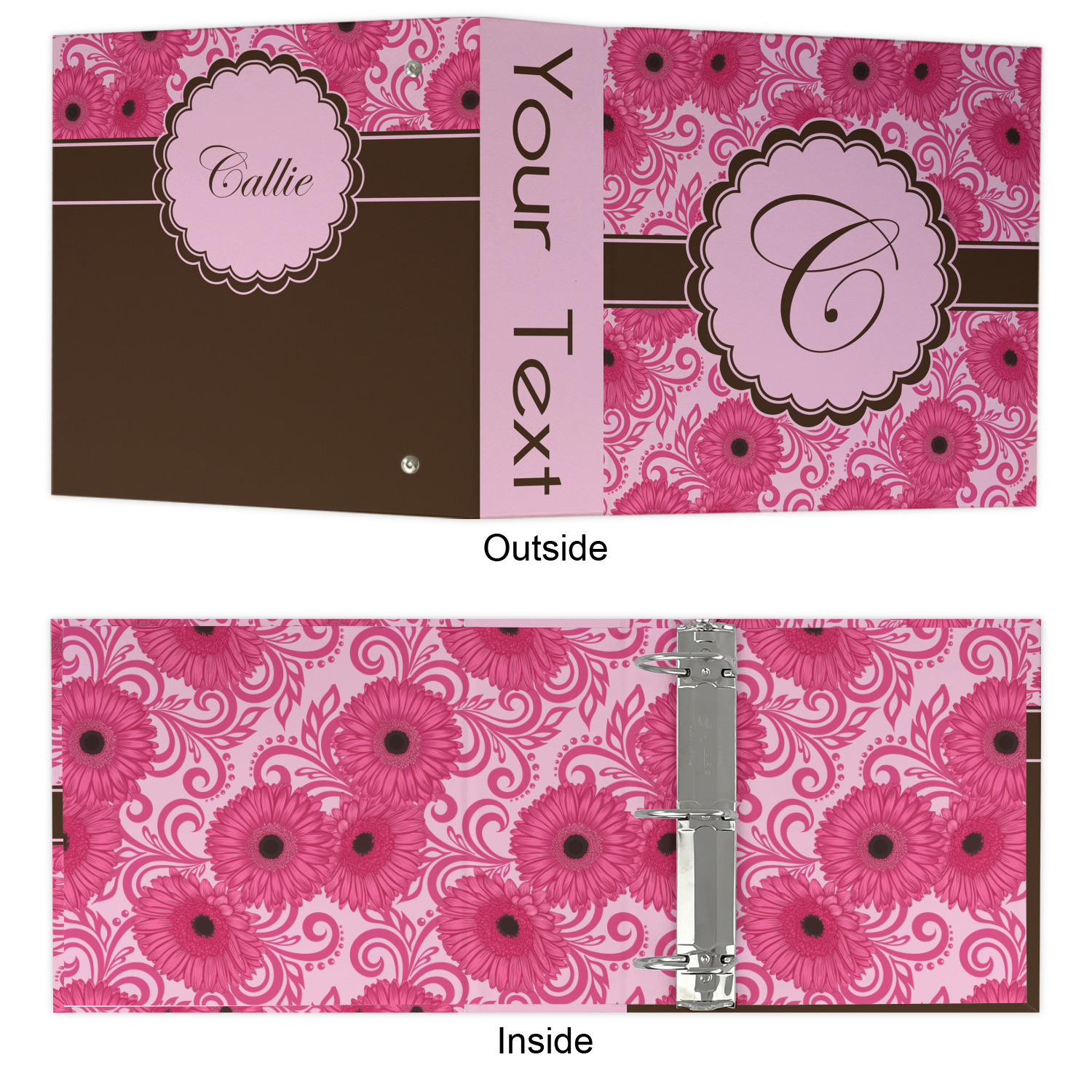 The outside is printed in 3 sections - front cover, spine and back cover - while the inside is printed in a full single print of your choice. The inside boasts a high quality nickel plated binder mechanism with a trigger opening function and is secured to the cardboard binder with posts and screws.