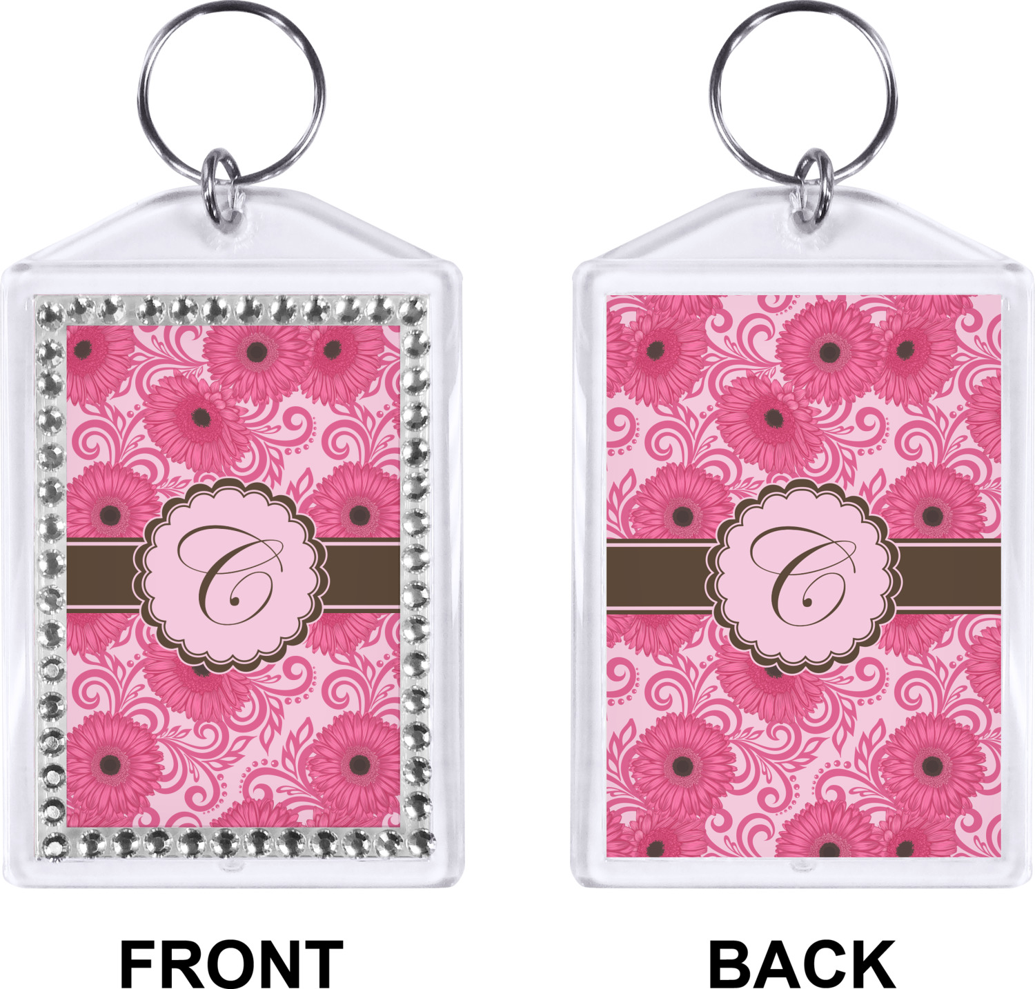 Our personalized keychains have a bold, rectangular shape, outlined by a series of shimmering rhinestones. A metal, split keyring is included with your purchase, and an additional metal hoop allows for attachment of the keychain to the split ring. This unique keychain measures at about 3.75 by 2.5 inches. We print your customized design(s) across both the back and front of this keychain.